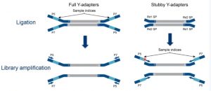 隨后對(duì)修復(fù)后的片段進(jìn)行接頭連接,主要是利用DNA連接酶,將3’端帶有dA的DNA片段與adapter接頭進(jìn)行連接。接頭的分類有兩種方式: