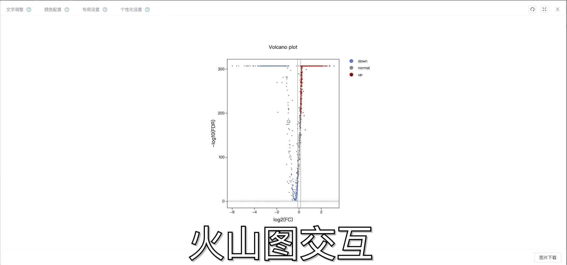 火山圖(Volcano Plot)可以快速地查看基因/物質(zhì)在兩個(組)樣品中表達水平的差異。火山圖的交互式支持自定義展示一定數(shù)目的重點差異基因,還支持支持選擇重點差異基因進行數(shù)據(jù)篩選,進行二次數(shù)據(jù)處理。