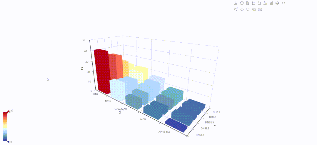 一次繪圖,多圖自由轉(zhuǎn)換。排列柱狀圖、堆疊柱狀圖、排列點線圖、堆疊點線圖、3D柱狀圖等互相自由切換。同時,只需點擊下legend圖例,即可取消掉過多的展示項,從而達到重新繪制的目的。滾動下鼠標,即可隱藏過多的樣品展示。