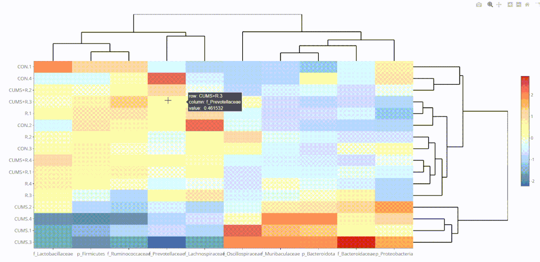 傳統(tǒng)聚類圖常用的參數(shù)均支持(如:橫列是否聚類等),同時鼠標懸空放置單元格上會顯示對應(yīng)的源數(shù)據(jù)信息,還支持相關(guān)性熱圖繪制。