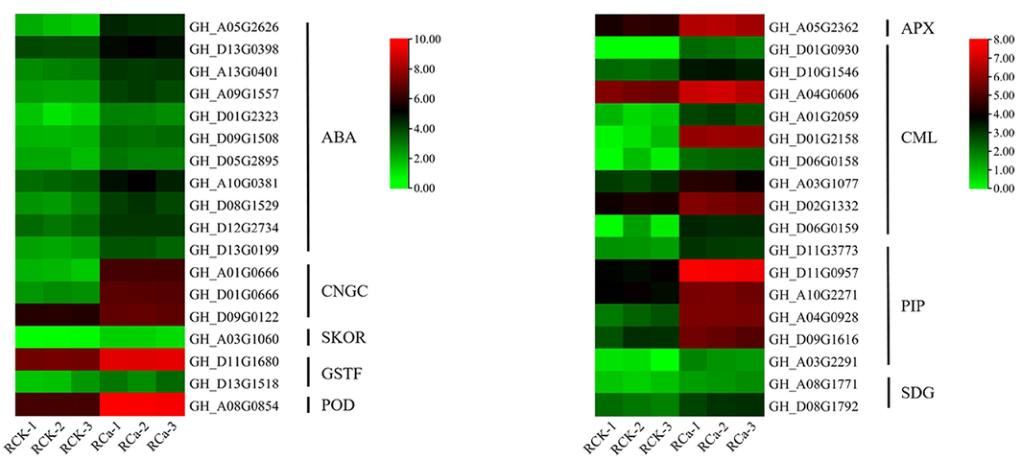 圖4高抗性棉花R對正常/異常濃度Ca2+脅迫的反應(yīng)(備注:CaM:鈣調(diào)蛋白;CML:鈣調(diào)素樣蛋白;CDPK:鈣依賴性蛋白激酶;ABRE:ABA反應(yīng)元件;MYBWRKYbHLH:轉(zhuǎn)錄因子;ABA:脫落酸;SA:水楊酸;SKOR:K通道;PIP:質(zhì)膜內(nèi)蛋白;TIP:液泡膜固有蛋白;PLR2:松脂醇-落葉松醇還原酶2編碼基因)