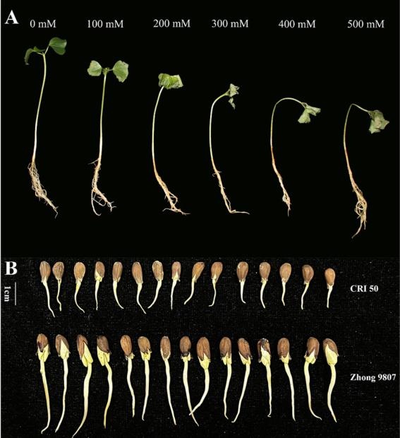 在本研究中,四個棉花品種的103份棉花材料在萌發(fā)期間受到200mMCaCl2脅迫。根據(jù)發(fā)芽情況,分別選擇了1份耐CaCl2脅迫的棉花品種(zhong9807,R)和1份對CaCl2脅迫敏感的品種(CRI50,S)。