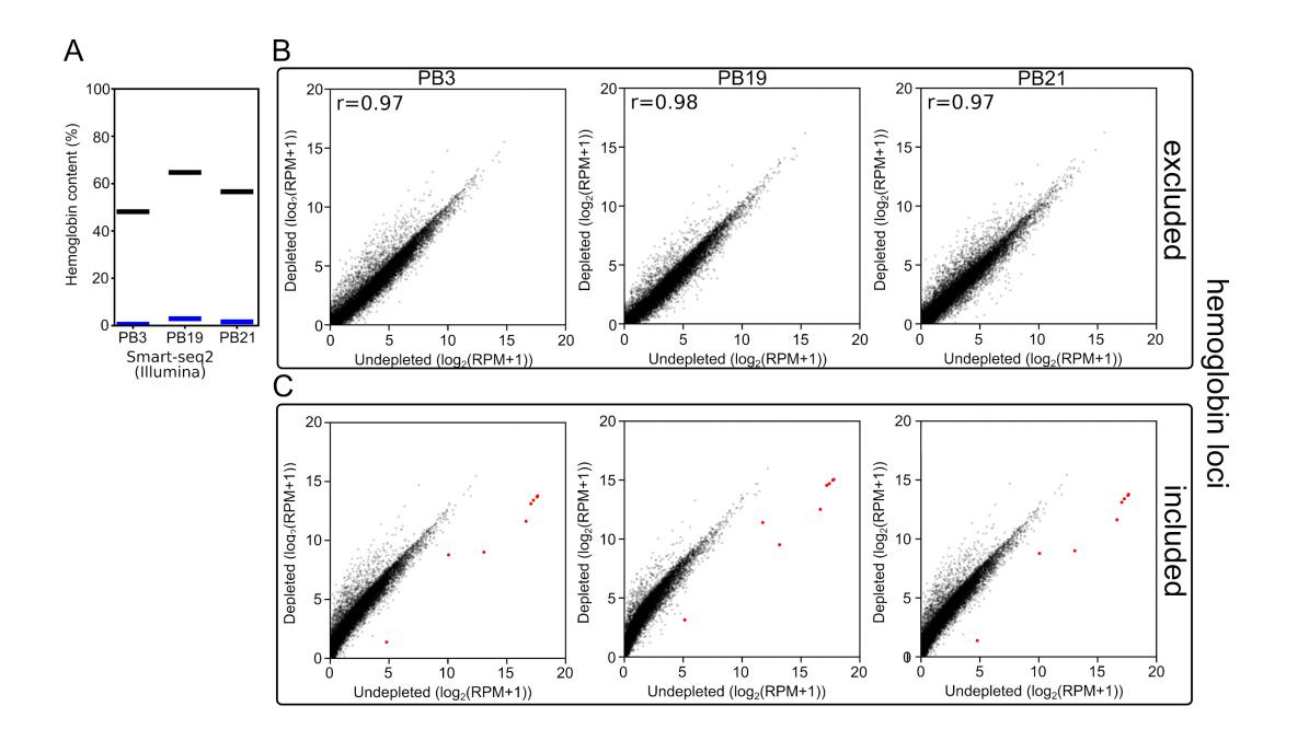 接下來(lái),本研究的目標(biāo)是驗(yàn)證Long-DASH是否真正消耗了cDNA池中的血紅蛋白轉(zhuǎn)錄本,并用Illumina公司的短讀RNA-seq測(cè)序平臺(tái)驗(yàn)證。為了說(shuō)明這一點(diǎn),本研究為每個(gè)去除的和未去除cDNA樣本混池準(zhǔn)備了獨(dú)立的基于Tn5的Smart-seq2文庫(kù)。然后,本研究在一個(gè)復(fù)合IlluminaHiSeqx2x151bp運(yùn)行測(cè)序Smart-seq2。去除血紅蛋白轉(zhuǎn)錄組本樣本產(chǎn)生了大約2000萬(wàn)reads,未去除的樣本產(chǎn)生了大約6000萬(wàn)reads。通過(guò)未去除樣本進(jìn)行高深度測(cè)序,本研究推斷,在去除樣本和未去除樣本中,非血紅蛋白基因獲得同等的讀取覆蓋率。這使本研究能夠?qū)θコ龢颖竞臀慈コ龢悠愤M(jìn)行并排比較,以確保沒(méi)有偏離目標(biāo)的影響。