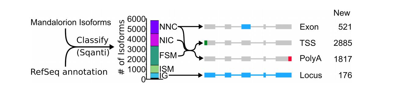 接下來(lái),本研究從本研究的全長(zhǎng)cDNA中生成了高度可信的信息,以完善當(dāng)前可用的北極熊轉(zhuǎn)錄組注釋。為此,本研究使用之前開(kāi)發(fā)的Mandalorion管道分析了380萬(wàn)個(gè)R2C2一致讀數(shù)。本研究使用minimap2將R2C2基因片段與北極熊基因組序列比對(duì)。這些排列,連同先前已知的個(gè)別剪接位點(diǎn),然后作為輸入文件到本研究的Mandalorion管道,讀取高可信度的異構(gòu)體。然后,本研究使用Squanti算法(33)對(duì)這5831個(gè)高可信剪接異構(gòu)體進(jìn)行分類,該算法確定了實(shí)驗(yàn)確定的異構(gòu)體與參考注釋中的基因和異構(gòu)體之間的關(guān)系(圖5)