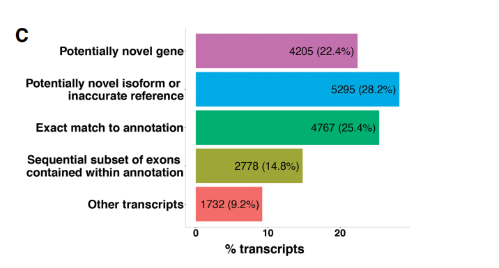 作者接著對全長轉(zhuǎn)錄組對已注釋基因鑒定到的未記錄的轉(zhuǎn)錄本的可變剪切形式的研究。 由于斑馬魚參考基因組對可變剪切的注釋較少,文章使用短讀長的轉(zhuǎn)錄組數(shù)據(jù)對可變剪切位 點進行驗證。作者使用 STAR 軟件分析轉(zhuǎn)錄組數(shù)據(jù),預(yù)測了 3000 個可變剪切位點,其中 99% 可以與全長轉(zhuǎn)錄本數(shù)據(jù)吻合。剪接位點的這種近乎完美的一致性支持證明了全長轉(zhuǎn)錄組鑒定 的外顯子 – 內(nèi)含子邊界的準(zhǔn)確性,并強烈支持新檢測到的可變剪接形式的有效性。通過全 長轉(zhuǎn)錄組共發(fā)現(xiàn)了 2000 種新型可變剪切類型,其中已注釋基因的新型可變剪切共 1835 中, 平均每個基因的可變剪切類型提升 50%。