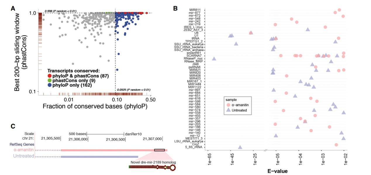 通過全長轉(zhuǎn)錄組鑒定到的大量新轉(zhuǎn)錄本中包括了一種重要 miRNA- miR-430,mir-430 可能是第一個表達的合子基因,它通過對所有母源轉(zhuǎn)錄基因進行的特異性沉默和降解將合子 基因的啟動和母體程序的消除連接起來。在以前的研究中,對其功能研究較多,而對于 miR-430 的來源研究較少。作者鑒定到了一個新的跨越 9kb 基因組序列的四外顯子轉(zhuǎn)錄本, 該轉(zhuǎn)錄本重疊 22 個 mir-430 重復(fù)序列,被稱為“mega-mir-430”。 在α-amanitin 處理中沒 有檢測到 mega-mir-430,并通過 qPCR 進行了驗證,推斷它來源于合子基因組。從每個 mega-mir-430 轉(zhuǎn)錄本產(chǎn)生多個 mir-430 的拷貝,這個發(fā)現(xiàn)解釋了合子基因激活時 mir-430 高表達的原因。