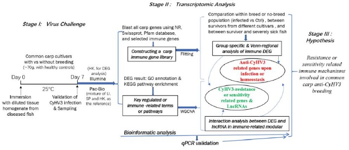 鯉魚皰疹病毒-3(CyHV-3)感染是鯉魚養(yǎng)殖的主要威脅,可導(dǎo)致鯉魚大量的死亡。CyHV-3可通過削弱宿主的免疫系統(tǒng)而使其死亡,導(dǎo)致其對(duì)病原微生物易感性,并可能在感染后6至10天內(nèi)出現(xiàn)發(fā)病和死亡。感染CyHV-3后存活下來的鯉魚可以抵抗這種病毒未來的感染。由于CyHV-3在鯉魚中存在潛伏期和持續(xù)性攜帶期,遺傳背景對(duì)于了解對(duì)病毒的耐藥性至關(guān)重要。德國(guó)鏡鯉品系G4是中國(guó)廣泛栽培的鯉魚品系,但因CyHV-3病毒引起高死亡率。然而目前在研究抗CyHV-3免疫機(jī)制的詳細(xì)免疫系統(tǒng)網(wǎng)絡(luò)方面,還缺乏系統(tǒng)的研究。最近的研究表明,lncRNAs在不同類型病原體感染時(shí)的廣泛差異表達(dá),表明lncRNAs在魚類免疫反應(yīng)中起著關(guān)鍵作用。然而,在CyHV-3感染期間,鯉魚體內(nèi)的特異性LncRNA對(duì)免疫反應(yīng)的調(diào)節(jié)尚未被研究。第三代測(cè)序(如PacBio)可以解碼比第二代測(cè)序方法(如Illumina)更長(zhǎng)的基因序列,包括mRNA和非編碼RNA在內(nèi)的更高質(zhì)量的轉(zhuǎn)錄本組裝,可能提供對(duì)遺傳抗性機(jī)制的更詳細(xì)理解。在本研究中,為了揭示鯉魚抗CyHV3育種中涉及的免疫機(jī)制,使用圖1所示的策略,對(duì)CyHV-3激發(fā)期間的mRNA和長(zhǎng)非編碼RNA(lncRNA)進(jìn)行了整合轉(zhuǎn)錄組學(xué)分析。對(duì)來自繁殖品系或非繁殖品系的存活鯉魚和健康對(duì)照鯉魚的免疫相關(guān)轉(zhuǎn)錄本進(jìn)行了分析。