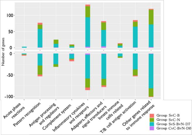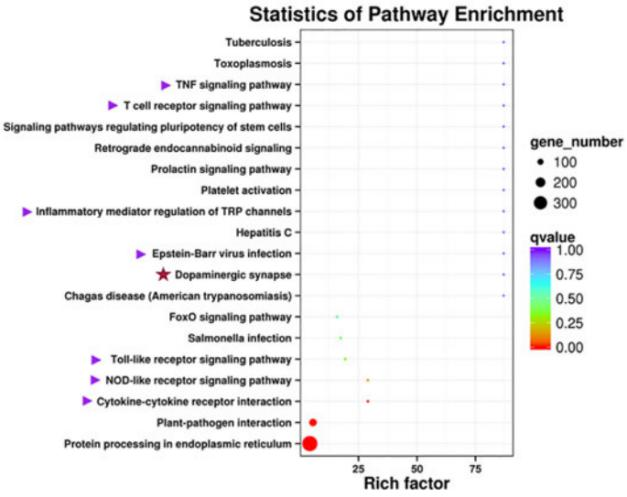 在CyHV-3感染后第0天和第7天提取鯉魚頭腎組織,并通過Illumina和PacBio測(cè)序分析轉(zhuǎn)錄組。在對(duì)涉及的GOterm和KEGG途徑進(jìn)行分析。加權(quán)基因共表達(dá)網(wǎng)絡(luò)分析用于揭示lncRNA對(duì)免疫基因的調(diào)節(jié)。結(jié)果表明,繁殖鯉魚品系通過一種特定的先天免疫機(jī)制對(duì)CyHV-3感染產(chǎn)生了顯著的抗性,主要的生物學(xué)過程是自噬、吞噬、細(xì)胞毒性和凝集素和MUC3阻斷病毒。此外,還有免疫抑制信號(hào)途徑,如IL21R對(duì)STAT3的抑制,PI3K介導(dǎo)的感染時(shí)多巴胺對(duì)炎癥的抑制,以及NLRC3在穩(wěn)定狀態(tài)下對(duì)STING的抑制。從非抗性品系中還發(fā)現(xiàn)了CyHV-3的可能易感因素,如ITGB1、TLR18和CCL4。本研究結(jié)果還表明,LncRNA調(diào)節(jié)的Nramp和PAI分別促進(jìn)病毒感染和感染細(xì)胞的增殖,而T細(xì)胞白血病同源框3(TLX3),以及l(fā)ncRNA的半乳糖凝集素3可能在抗病制中發(fā)揮作用。因此,免疫遺傳不敏感或易受CyHV-3感染的免疫因子已被揭示。