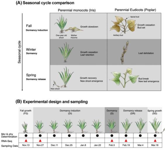 冬季休眠是植物應(yīng)對潛在致命環(huán)境的最關(guān)鍵策略。近幾十年來,由于氣候的變化,在經(jīng)濟上具有重要意義的多年生雙子葉植物中的這一過程得到了廣泛的研究。然而,在不需要冷卻的常綠單子葉植物中,休眠過程至今仍是一個謎。因此,揭示這些單子葉植物越冬休眠的調(diào)控機制,不僅有助于更好地開發(fā)利用植物資源,而且對應(yīng)對全球變暖帶來的低溫不足的挑戰(zhàn)具有重要意義。通過多年物候觀測發(fā)現(xiàn),鳶尾和蝴蝶花越冬休眠過程均僅有生態(tài)休眠,將休眠植株移至適宜條件下能迅速恢復(fù)生長,且在同一栽培地區(qū)二者越冬休眠期存在明顯差異,是研究多年生單子葉植物越冬休眠機理的理想材料。本研究比較了鳶尾(I.tectorum)和蝴蝶花(I.japonica)在關(guān)鍵發(fā)育時間點的休眠過程。這兩種鳶尾都表現(xiàn)出短暫的休眠過程,且持續(xù)時間不同,在溫暖條件下都能很容易地恢復(fù)生長。為了破譯轉(zhuǎn)錄變化,作者對鳶尾進(jìn)行了全長測序,對蝴蝶花進(jìn)行了RNA-seq測序,分別生成參考轉(zhuǎn)錄組,揭示了調(diào)控常綠與落葉類鳶尾越冬休眠的分子機制。