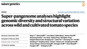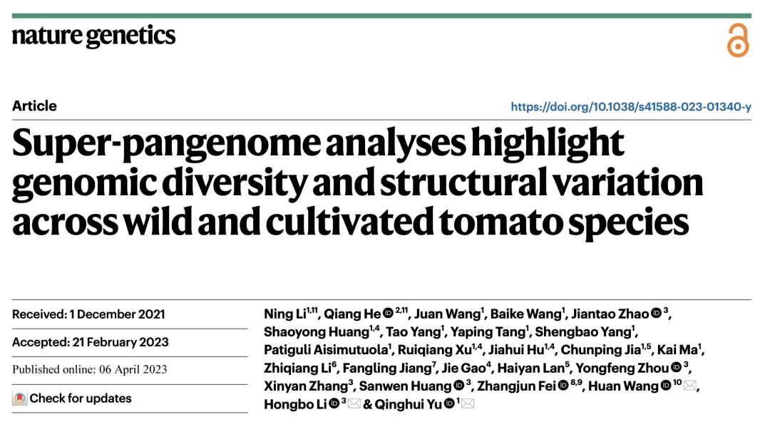 2023年4月6日,Nature Genetics《自然·遺傳學》發(fā)表了由新疆農(nóng)業(yè)科學院園藝作物研究所牽頭,中國農(nóng)業(yè)科學院深圳農(nóng)業(yè)基因組研究所、作物科學研究所、生物技術研究所等團隊合作完成的題為Super-pangenome analyses highlight genomic diversity and structural variation across wild and cultivated tomato species的研究論文。該研究繪制了11個野生和栽培番茄的染色體級別高質(zhì)量基因組圖譜,闡明了茄屬番茄組(Solanum?section?Lycopersion)的基因組演化歷史,構(gòu)建了番茄超級泛基因組/圖基因組,并進一步在野生番茄中克隆到可大幅提升栽培番茄產(chǎn)量的新基因一個。該研究既是對番茄基因組資源的重要補充,同時也對其它作物基因組學研究和野生種質(zhì)資源尤其是近緣野生種的利用具有重要啟發(fā)意義。該成果也是新疆農(nóng)業(yè)科學院首次以第一單位在Nature Genetics上發(fā)表長篇研究論文。?百邁客為本研究提供了相關測序及分析服務。