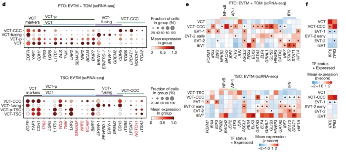 a.PTOs比TSCs更好地體現(xiàn)VCT的異質(zhì)性。b.在PTOs中存在體內(nèi)定義的四個(gè)VCT亞群,,它們表達(dá)相同的典型標(biāo)志物。c.在PTO中,VCT-CCC在EVTM存在下富集,觸發(fā) FOXM1–NOTCH1 軸 NF-κB (NFKB2和BACH2)和AP-1調(diào)制器(JDP2和ATF3),相比之下,在TSC中找不到真正的VCT。D.在TSC和PTO中,VCT-CCC(CDH5,ITGB6和LCAT1)在EVTM培養(yǎng)基存在下富集,從而觸發(fā)NOTCH–FOXM1軸,導(dǎo)致 IRF6 進(jìn)一步下調(diào)和 EVT-1 中的 TP6323。