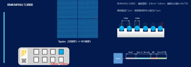 發(fā)布會(huì)中,百邁客生物智能制造副總裁劉敏對(duì)百創(chuàng)S3000空間轉(zhuǎn)錄芯片的性能進(jìn)行了詳細(xì)介紹。百創(chuàng)S3000在6.8mm*6.8mm的捕獲區(qū)域內(nèi)鋪設(shè)了4,144,770個(gè)捕獲位點(diǎn),相鄰兩個(gè)捕獲位點(diǎn)的中心距為3.5μm。相較于現(xiàn)在廣受市場(chǎng)認(rèn)可與好評(píng)的百創(chuàng)S1000轉(zhuǎn)錄組芯片,捕獲位點(diǎn)數(shù)提升近2倍,分辨率同樣提升近2倍。