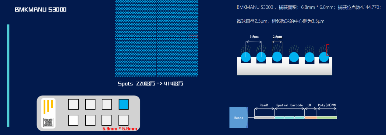 百創(chuàng)S3000在6.8mm*6.8mm的捕獲區(qū)域內(nèi)鋪設(shè)了4,144,770個(gè)捕獲位點(diǎn),相鄰兩個(gè)捕獲位點(diǎn)的中心距為3.5μm。
