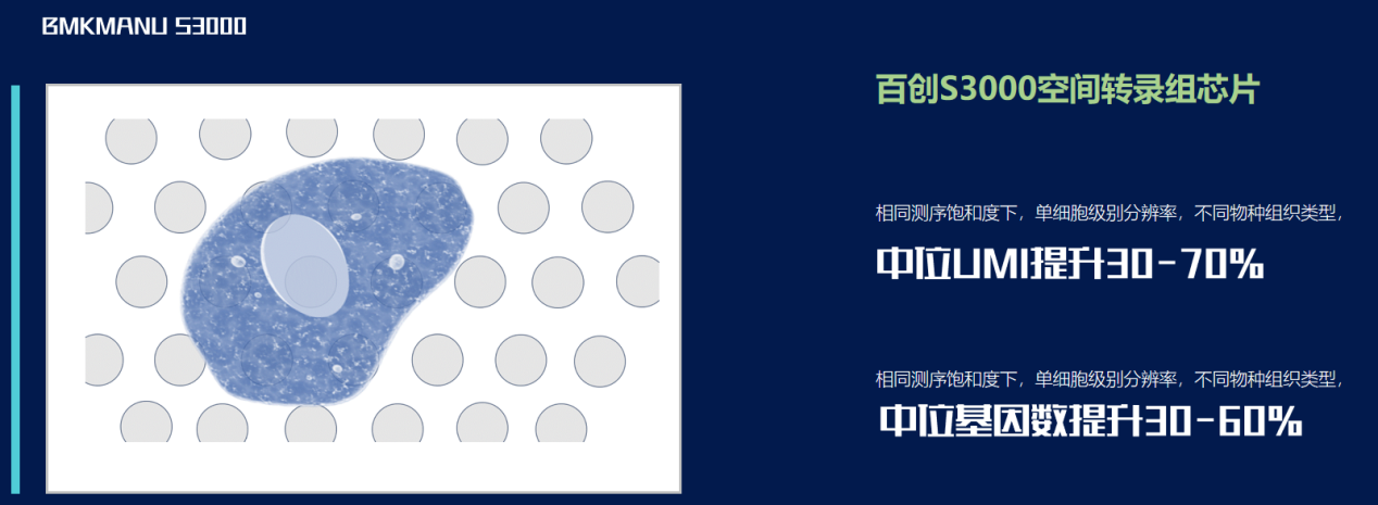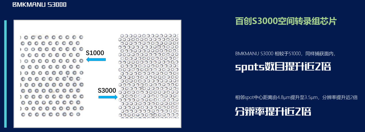 相較于現(xiàn)在廣受市場(chǎng)認(rèn)可與好評(píng)的百創(chuàng)S1000轉(zhuǎn)錄組芯片,捕獲位點(diǎn)數(shù)提升近2倍,分辨率同樣提升近2倍