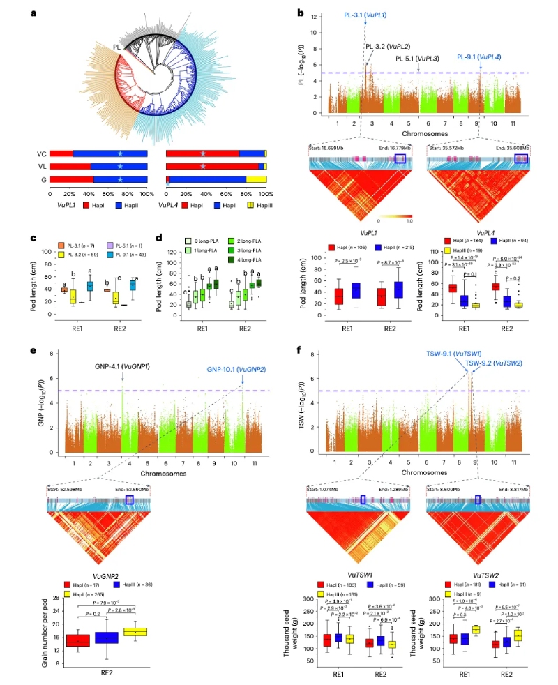 本研究結(jié)合PacBio、Hi-C和二代測序,組裝了糧用豇豆和菜用豇豆的染色體水平基因組。對包括地方品種、野生品種和育成品種的344個材料進行二代測序,以闡明豇豆基因組的系統(tǒng)進化。此外,還進行了全基因組關(guān)聯(lián)分析(GWAS),確定關(guān)鍵產(chǎn)量和品質(zhì)性狀相關(guān)基因。該研究揭示了兩個亞種之間基因組結(jié)構(gòu)變異(SVs)的全圖譜,為豇豆在全基因組選擇下的馴化與改良提供了見解。產(chǎn)量性狀和品質(zhì)性狀的差異基因組選擇將有助于建立糧用豇豆和菜用豇豆雙向改良的遺傳資源。