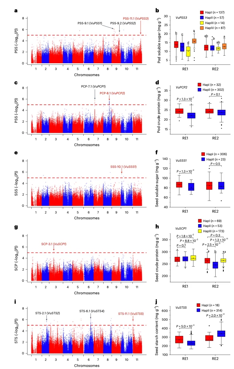 可溶性糖、總淀粉和粗蛋白質(zhì)含量是豆科作物的三個基本品質(zhì)性狀。GWAS分析檢測到三個信號與嫩莢可溶性糖含量(PSS)顯著相關(guān)(圖6a),其中VuPSS1可能是功能相關(guān)基因,VuPSS2可能通過其順式調(diào)控元件影響PSS含量,VuPSS3-HapIV單倍型是PSS的有利單倍型。嫩莢粗蛋白含量(PCP)差異可能與有利單倍型VuPCP1-HapII和VuPCP2-HapI有關(guān)。籽??扇苄蕴牵⊿SS)含量相關(guān)的信號(圖6e)包含一個FAR1-related SEQUENCE (FAR1)家族蛋白(VuSSS1),F(xiàn)AR1在淀粉合成以及糖的運輸和降解中起作用,VuSSS1-HapI為其有利單倍型(圖6f)。VuSCP2-HapIII和VuSCP2-HapIV通常導(dǎo)致更高的籽粒粗蛋白含量(SCP),VuSCP1和VuSCP2相似的表達模式提示它們可能影響種子發(fā)育中期的SCP表型。籽??偟矸酆浚⊿TS)GWAS分析檢測到5個相關(guān)信號(圖6i),STS-2.1中的VuSTS2含有一個MYB轉(zhuǎn)錄因子,STS-11.1中的VuSTS5編碼一個磷脂酰絲氨酸脫羧酶,該酶可能影響植物發(fā)育的關(guān)鍵調(diào)節(jié)因子磷脂酰絲氨酸。兩種基因的不同單倍型在兩種環(huán)境中表現(xiàn)出不同的STSs,這表明它們在很大程度上受環(huán)境條件的影響(圖6j)。STS-3.1中的VuSTS3編碼了一個未知的蛋白,其中VuSTS3-HapIII對STS的影響最大。STS-6.1含有一個NAD依賴性蛋白去乙?;竀uSTS4,可能影響淀粉的生物合成和調(diào)控,而VuSTS4-HapI對STS的作用更強。以上結(jié)果有潛力成為糧用豇豆和菜用豇豆產(chǎn)量和品質(zhì)改善的遺傳資源。