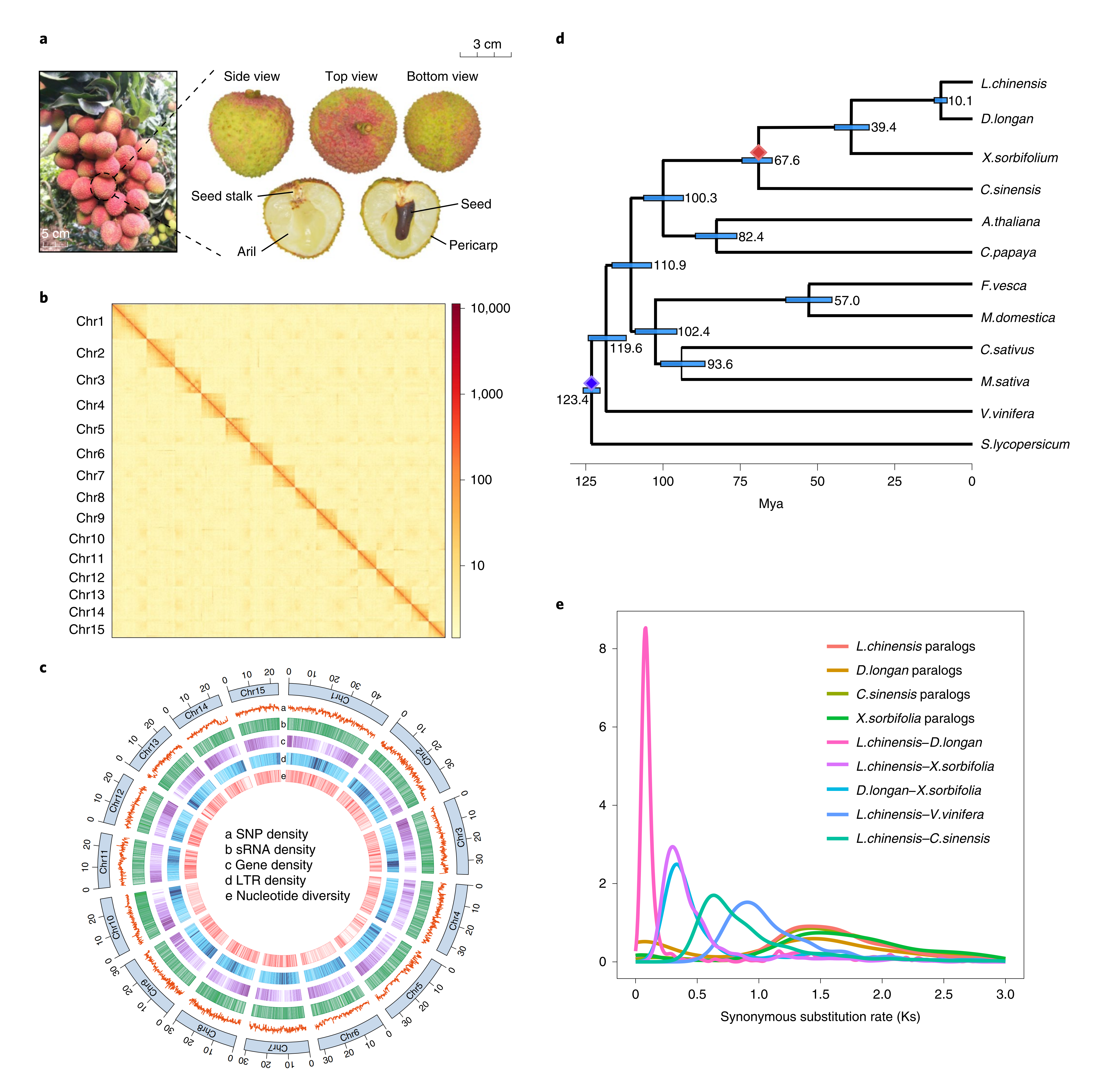 比較基因組分析表明,荔枝和龍眼-10百萬(wàn)年前(mya)從祖先物種中分離開(kāi)來(lái),而荔枝所在的無(wú)患子科與蕓香科大約在67.6mya分離開(kāi)。荔枝、龍眼、文冠果和甜橙自共享y三倍化事件后并無(wú)獨(dú)立的WGD事件。
