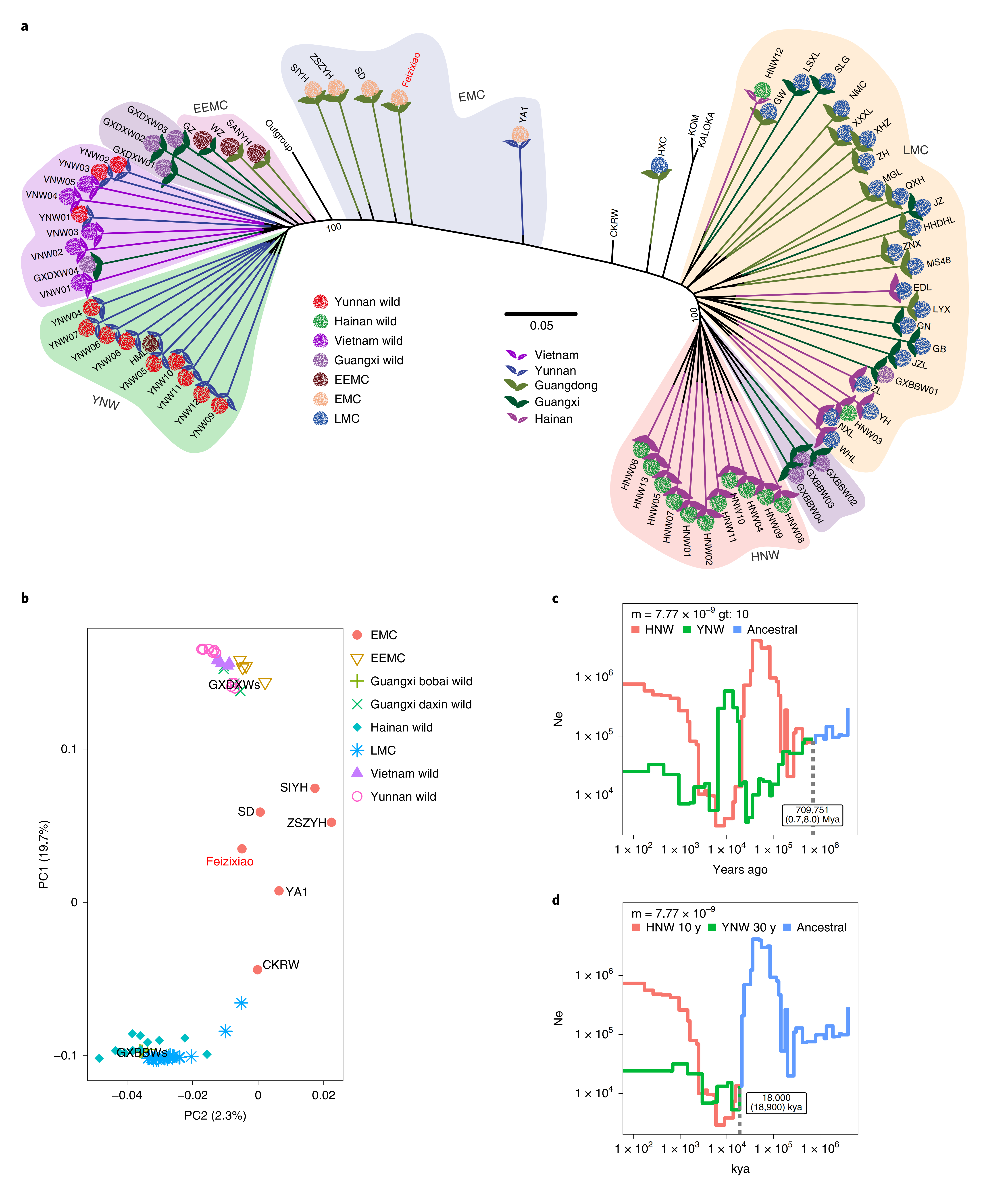 利用通過(guò)對(duì)72份荔枝進(jìn)行重測(cè)序分析,發(fā)現(xiàn)荔枝大致可分為3個(gè)群體,即云南極早熟品種(EEMC/YNW)、海南晚熟品種(LMCHNW)、早熟栽培種(EMC)。其中值得注意的是,大新野生和博白野生荔枝雖然都位于廣西,但兩者間卻存在明顯的遺傳差異。分析發(fā)現(xiàn)云南野生種群經(jīng)歷了強(qiáng)烈的馴化瓶頸。