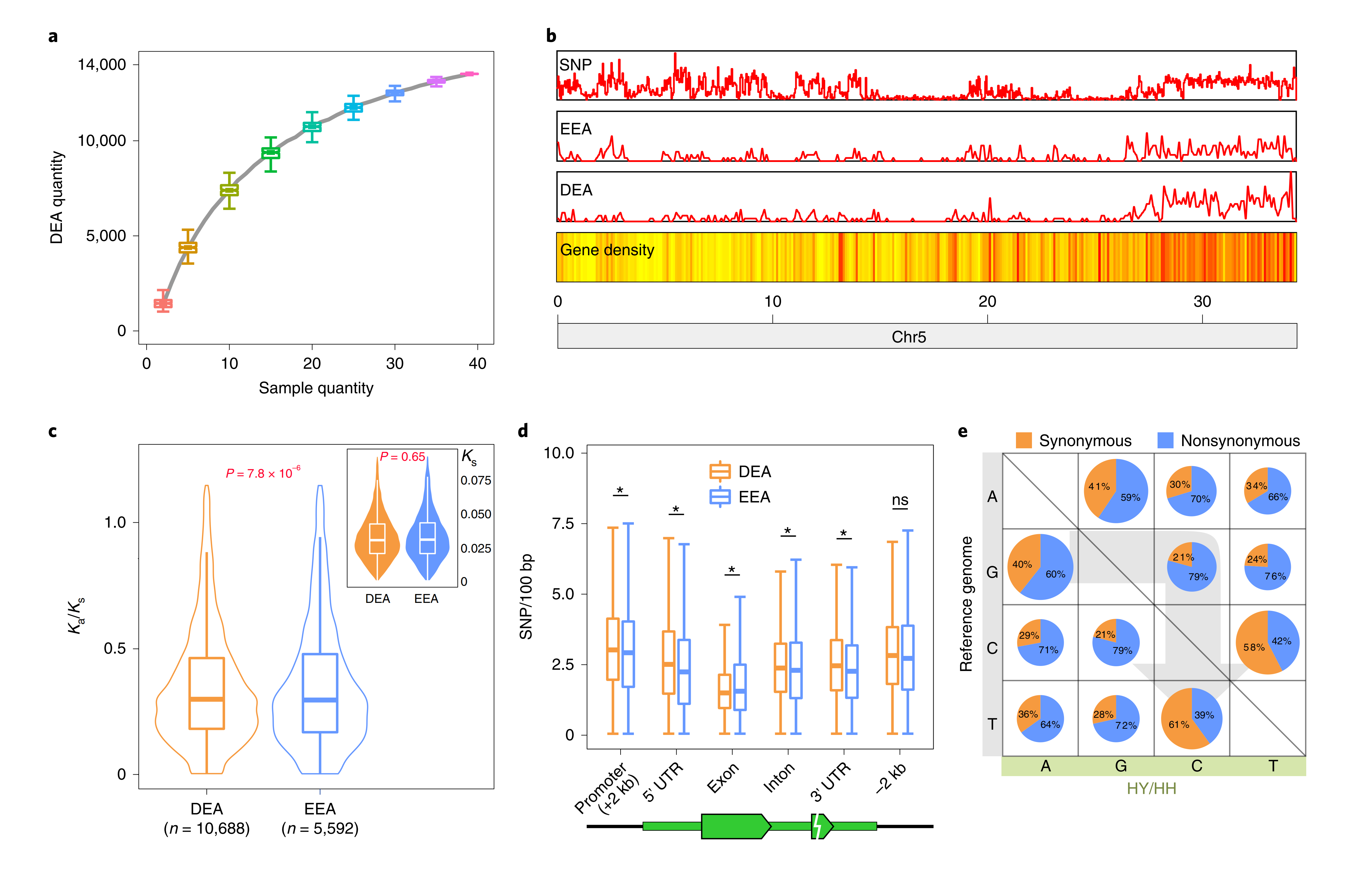 作者通過(guò)SNP分型和單細(xì)胞10x?Gemomics測(cè)序,利用“妃子笑”荔枝的高雜合性(2.27%),成功獲得的兩個(gè)單倍型的基因組(云南單倍型,HY;海南單倍型,HH)。對(duì)39個(gè)妃子笑”不同組織和時(shí)期樣本進(jìn)行轉(zhuǎn)錄組測(cè)序分析,共鑒定到13517個(gè)等位差異表達(dá)基因(DEA)。DEA在基因組上的分布并不是均勻的,在某些區(qū)域具有集中現(xiàn)象,可能與特定的生物學(xué)過(guò)程相關(guān)。還發(fā)現(xiàn),DEA和等位等量表達(dá)基因(EEA)具有相同的Ks值,但是DEA經(jīng)受更強(qiáng)的選擇壓力。