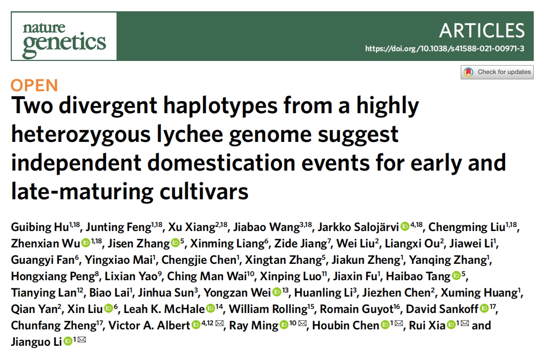 基于荔枝(Litchi chinensis)基因組的高度雜合(~2.27%),構(gòu)建了兩套高質(zhì)量妃子笑”單倍型基因組(470 Mb)。72份荔枝重測(cè)序分析發(fā)現(xiàn),來(lái)自云南的一個(gè)野生群體的極早熟荔枝品種主要與“妃子笑”的其中一個(gè)單倍型對(duì)應(yīng);來(lái)自海南的一個(gè)野生群體的晚熟荔枝品種則與另外一個(gè)單倍型對(duì)應(yīng)。早熟荔枝品種可能是極早熟荔枝品種與晚熟荔枝品種的雜交形成的,在廣東培育而成。包含一對(duì)CO-likc基因的3.7kb序列的缺失變異可能調(diào)控著不同荔枝品種間的果實(shí)成熟差異。