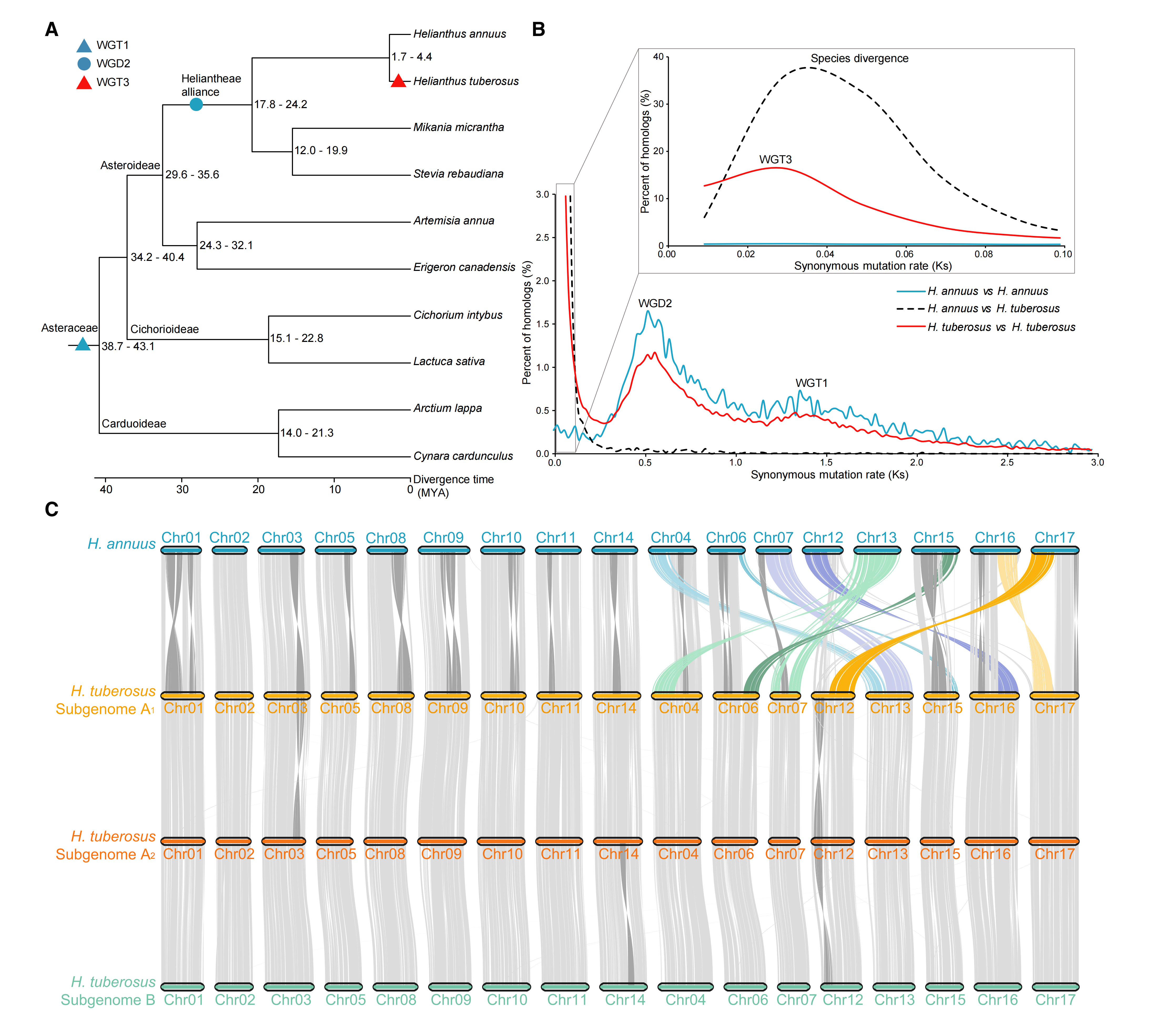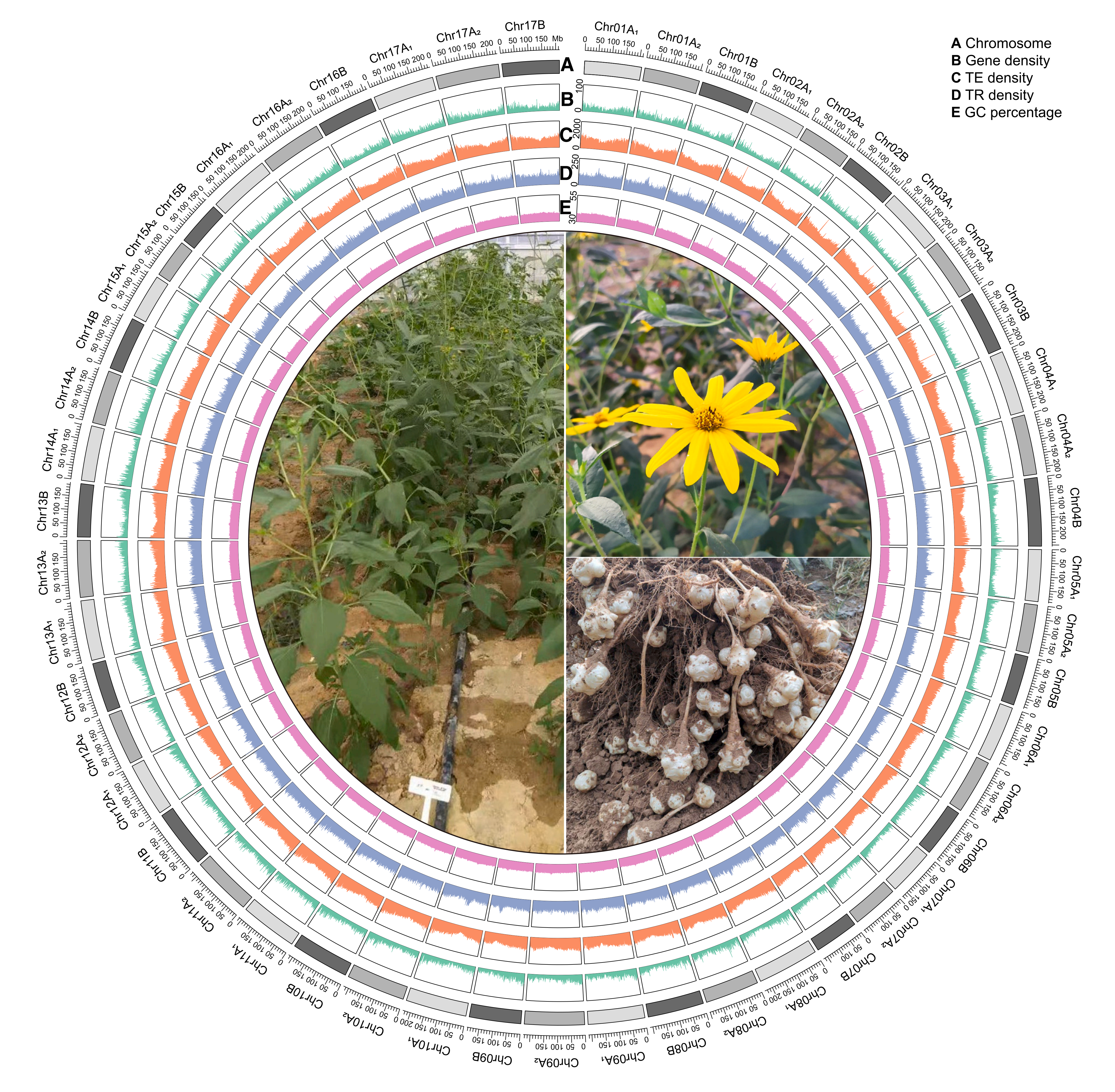 今天的菊芋基因組經(jīng)歷了約4500萬年前菊科祖先發(fā)生的全基因組三倍化,約2900萬年前向日葵超族祖先發(fā)生的全基因組加倍,以及約2百萬年前菊芋與向日葵分化后發(fā)生的全基因組三倍化事件。同源染色體單拷貝直系同源基因的進(jìn)化分析表明,最近的三倍化是菊芋二倍體與四倍體祖先發(fā)生的種間雜交和染色體加倍事件,故菊芋基因組包含了A1, A2、B三個亞基因組。除基因組多倍化事件外,向日葵屬內(nèi)大規(guī)模染色體重排、轉(zhuǎn)座子活動、基因突變和人工馴化選擇等過程共同塑造了現(xiàn)在的六倍體菊芋基因組。