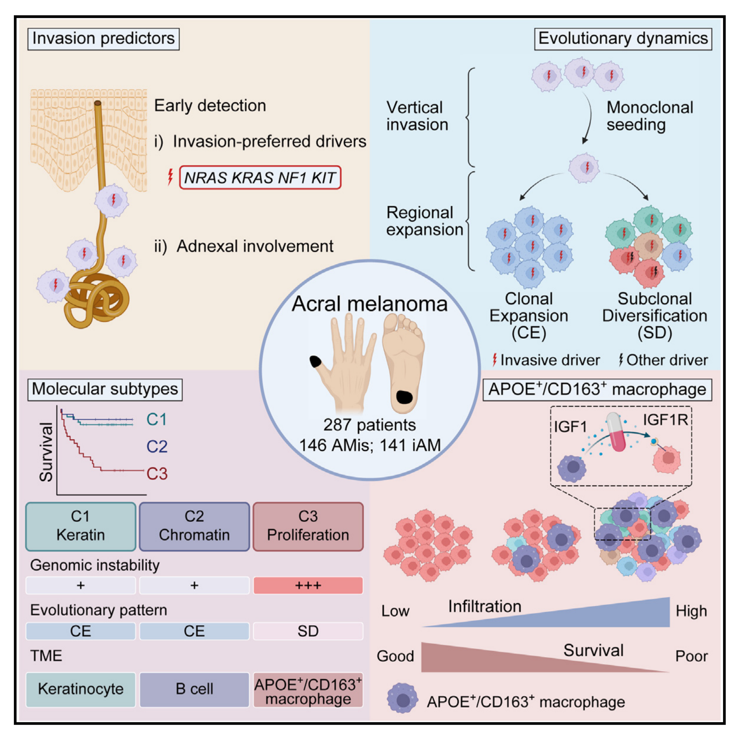 2024年5月16日,北京大學(xué)第一醫(yī)院的張寧、李航及北京大學(xué)-云南白藥國際醫(yī)學(xué)中心薛瑞棟團隊合作在《Cancer Cell》在線發(fā)表題為《Integrative molecular and spatial analysis reveals evolutionary dynamics and tumor-immune interplay of in situ and invasive acral?melanoma》的研究論文,對肢端型黑色素瘤進行了多組學(xué)分析,解析了從AMis進展到iAM的克隆演化規(guī)律,建立了AM的分子分型,揭示了APOE+/CD163+巨噬細胞的空間富集狀態(tài),進一步通過實驗證實該巨噬細胞亞群可通過IGF1-IGF1R互作促進腫瘤發(fā)生上皮-間質(zhì)轉(zhuǎn)化,最終鑒定出附屬器受累和驅(qū)動突變可預(yù)測AMis的侵襲潛能,而APOE和CD163則可用于預(yù)測iAM的預(yù)后,為肢端型黑色素瘤的早期診斷和臨床診療提供了重要依據(jù)。