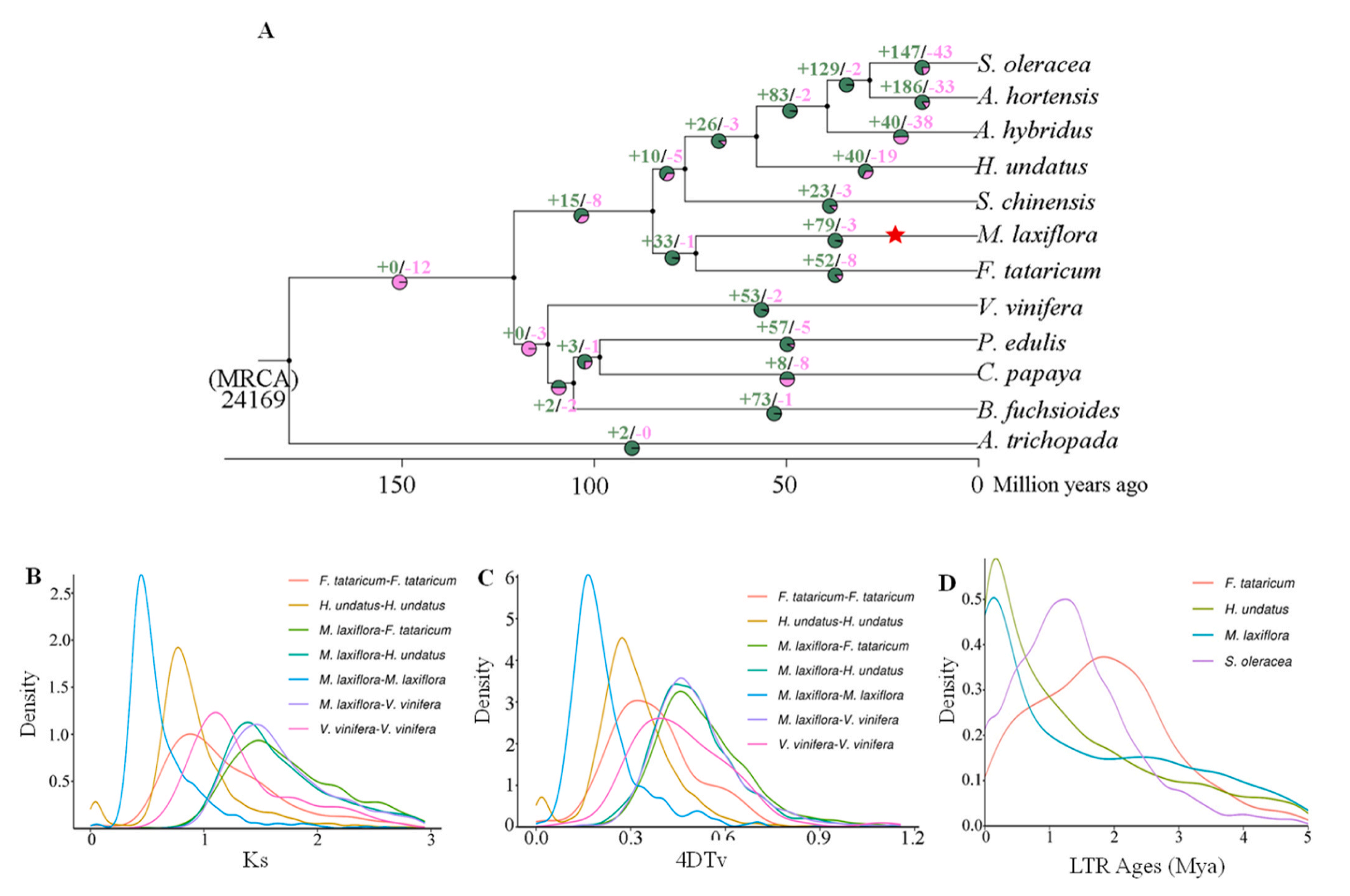 比較基因組研究發(fā)現(xiàn)疏花水柏枝與苦蕎(F. tataricum)的親緣關(guān)系最為密切,大約在65-81百萬年前(Mya)發(fā)生分化;在19.74 ~ 24.60 Mya之間發(fā)生了一次全基因組復制(WGD), 4dTV分析證實了這一點。在0.15 Mya左右存在一個長末端重復(LTR)插入。這些基因組變化可能與疏花水柏枝在進化過程中所經(jīng)歷的環(huán)境劇變(如青藏高原隆升)有關(guān)。基因家族分析顯示疏花水柏枝的特有基因家族與能量代謝和信號轉(zhuǎn)導密切相關(guān);85個基因在疏花水柏枝基因組中經(jīng)歷了正選擇,這些基因在與氨基酸合成和代謝相關(guān)的KEGG通路中顯著富集。
