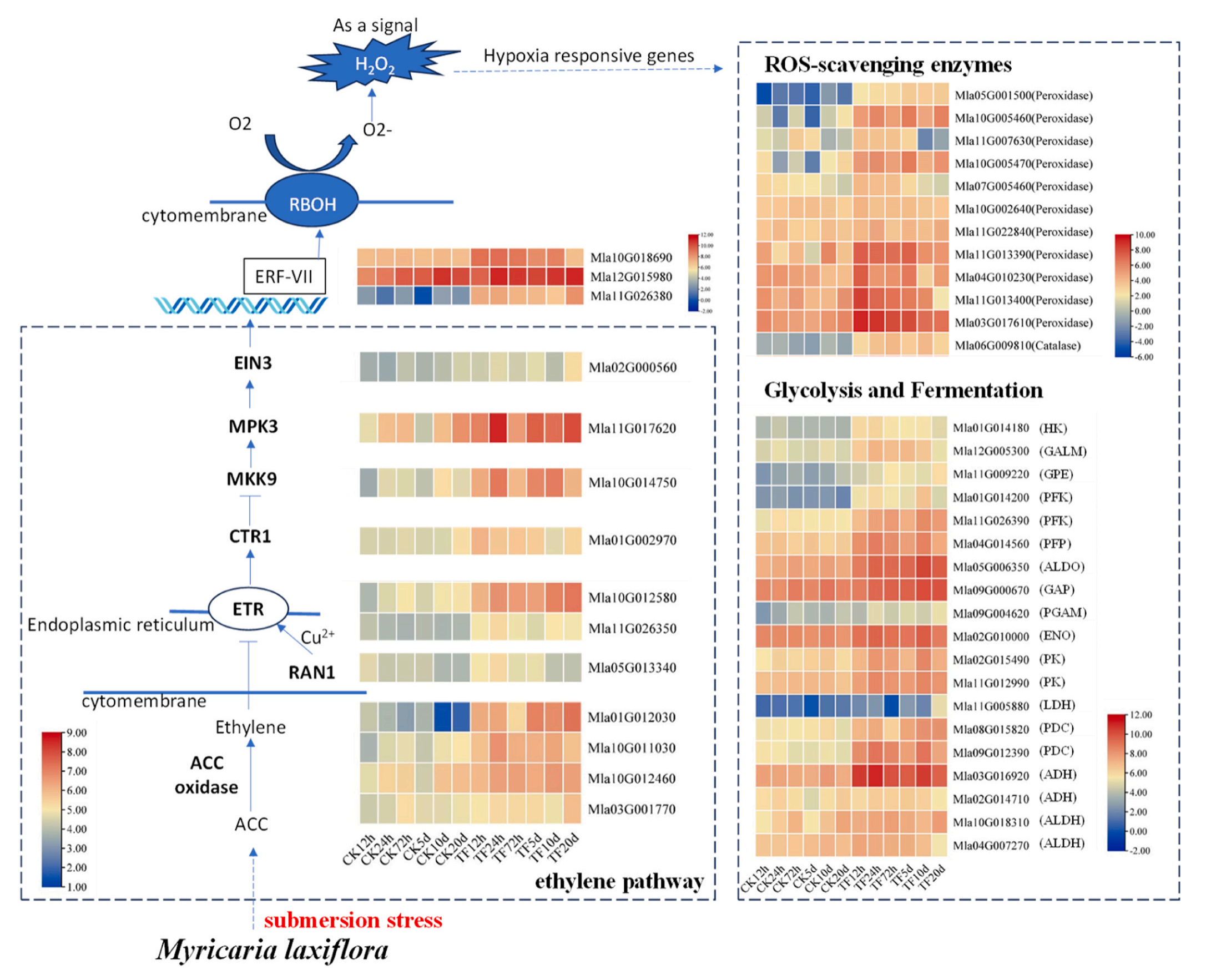 作者通過比較水淹和對照條件下疏花水柏枝形態(tài)、生理和轉(zhuǎn)錄組學的變化,分析了植物對水淹的適應(yīng)機制??傮w而言,在完全淹沒的狀態(tài)下,疏花水柏枝采用“靜止”的策略。具體來說,在淹水條件下,光合作用減弱,生長停滯,糖酵解被激活,抗氧化酶系統(tǒng)增強。乙烯反應(yīng)途徑可能是這一過程的調(diào)控因子,MlERF-VII基因(Mla11G026380)可能是調(diào)控這一過程的關(guān)鍵基因。