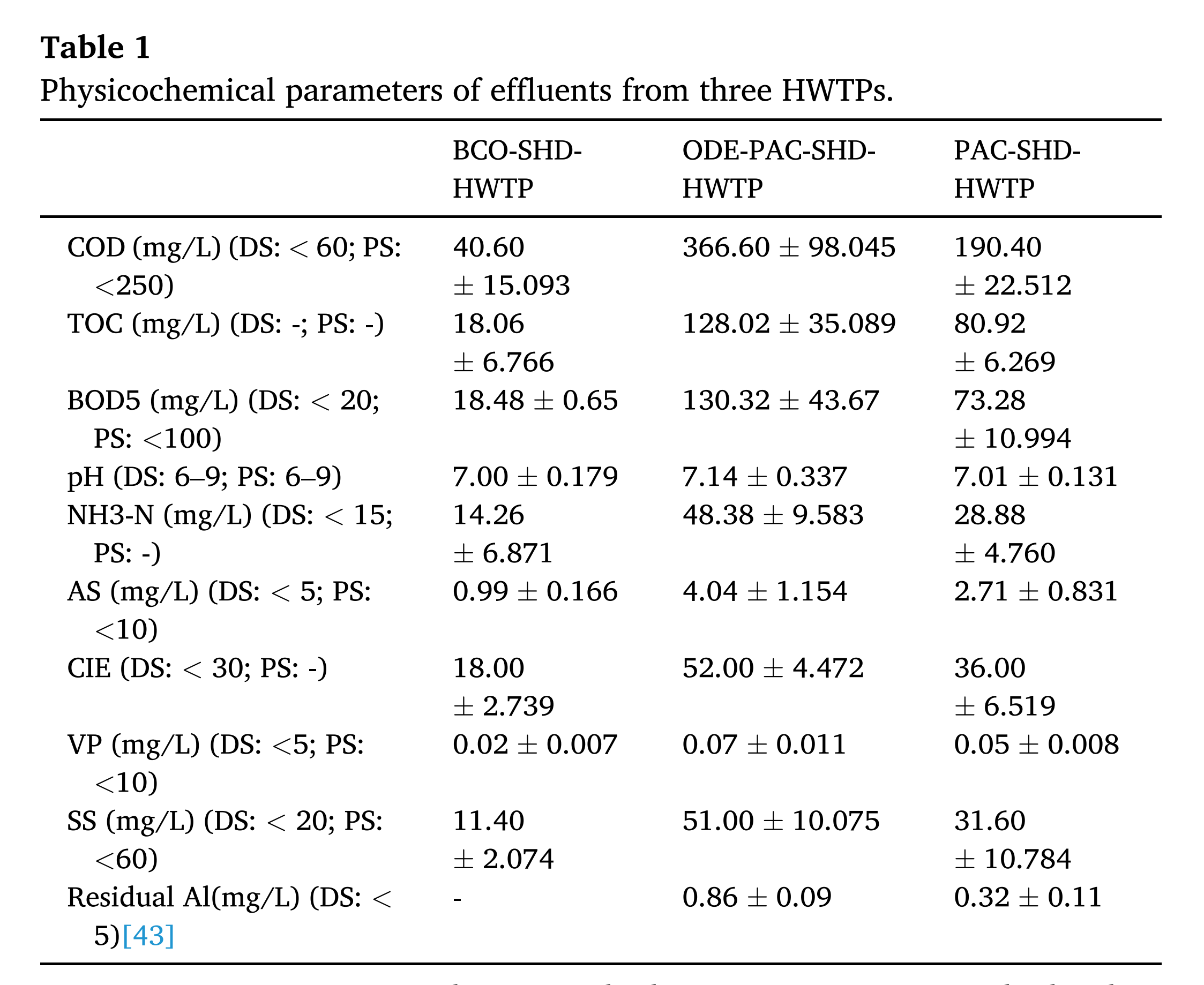 該研究共同評估了九種常見的理化指標(biāo),這些指標(biāo)在三個(gè)污水處理廠的出水點(diǎn)表現(xiàn)出明顯的梯度分布。在這些指標(biāo)上,ODE-PAC-HWTP 超過了 PAC-HWTP,PAC-HWTP 超過了 BCO-HWTP。BCO-HWTP出水中COD、BOD5、pH、NH3-N、AS、Color、VP、SS等濃度基本符合國家排放標(biāo)準(zhǔn)。PAC-HWTP 出水的 COD、BOD5、pH、NH3-N、AS、顏色、VP 和 SS 水平通常符合國家預(yù)處理標(biāo)準(zhǔn),允許排放到通向市政污水處理廠的下水道中。相反,ODE-PAC-HWTP出水中COD和BOD5的濃度超過國家預(yù)處理標(biāo)準(zhǔn)。此外,還對兩個(gè)經(jīng) PAC 處理的 HWTP 出水中的殘留鋁濃度進(jìn)行了測試。在 ODE-PAC-HWTP 和 PAC-HWTP 的出水中,檢測到的殘留 Al 濃度分別為 0.86 ± 0.09 mg/L 和 0.32 ± 0.11 mg/L。這些值符合 2002 年環(huán)境保護(hù)法制定的鋁廢水排放標(biāo)準(zhǔn),該標(biāo)準(zhǔn)規(guī)定限值為 5.0 mg/L 。