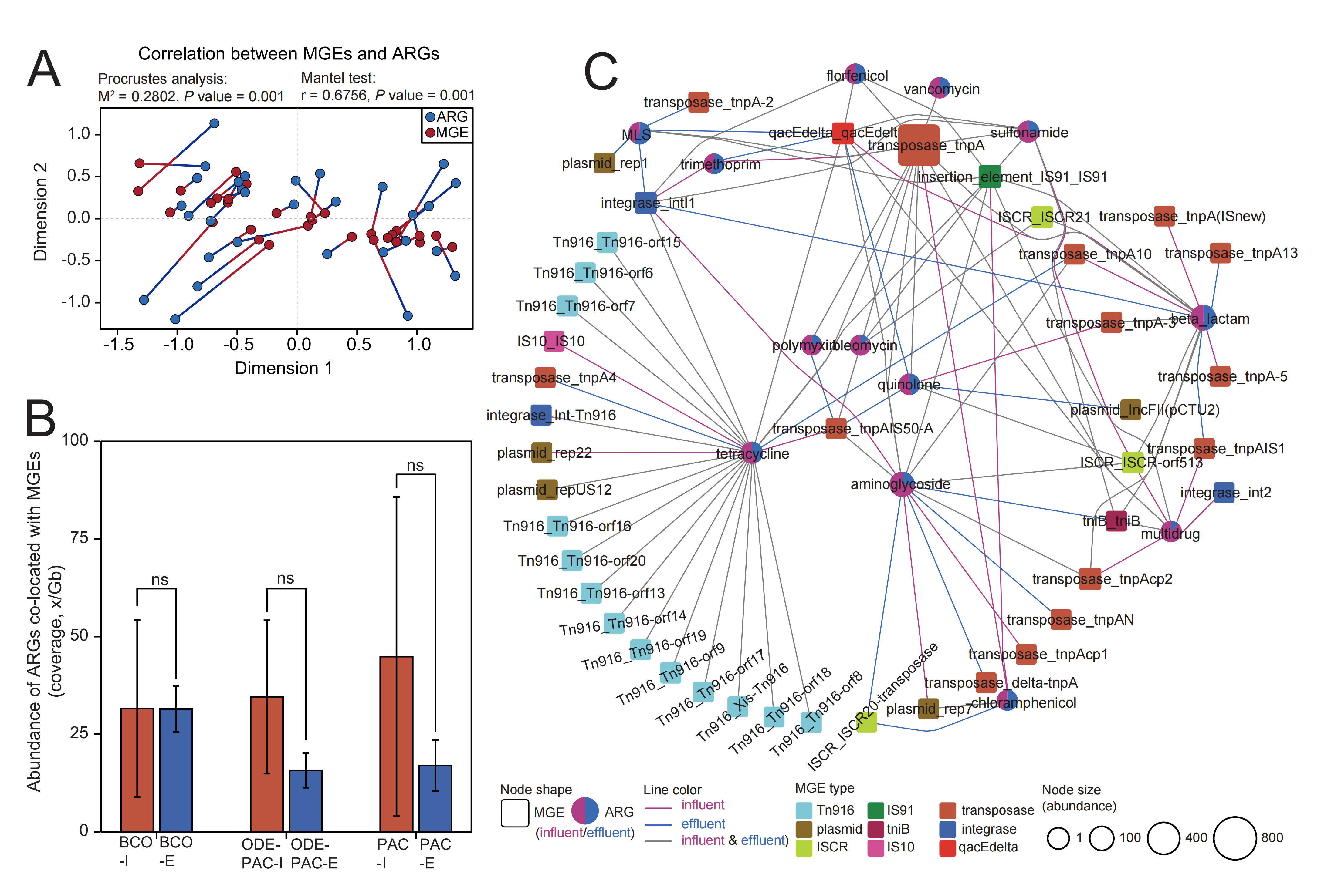 圖3-(A)Procrstes分析和Mantel檢驗(yàn)。(B)三個(gè)熱泵的進(jìn)水和出水中與MRG共存的ARG的相對豐度的差異。(C)顯示MRG和ARG類型同時(shí)出現(xiàn)的網(wǎng)絡(luò)圖。