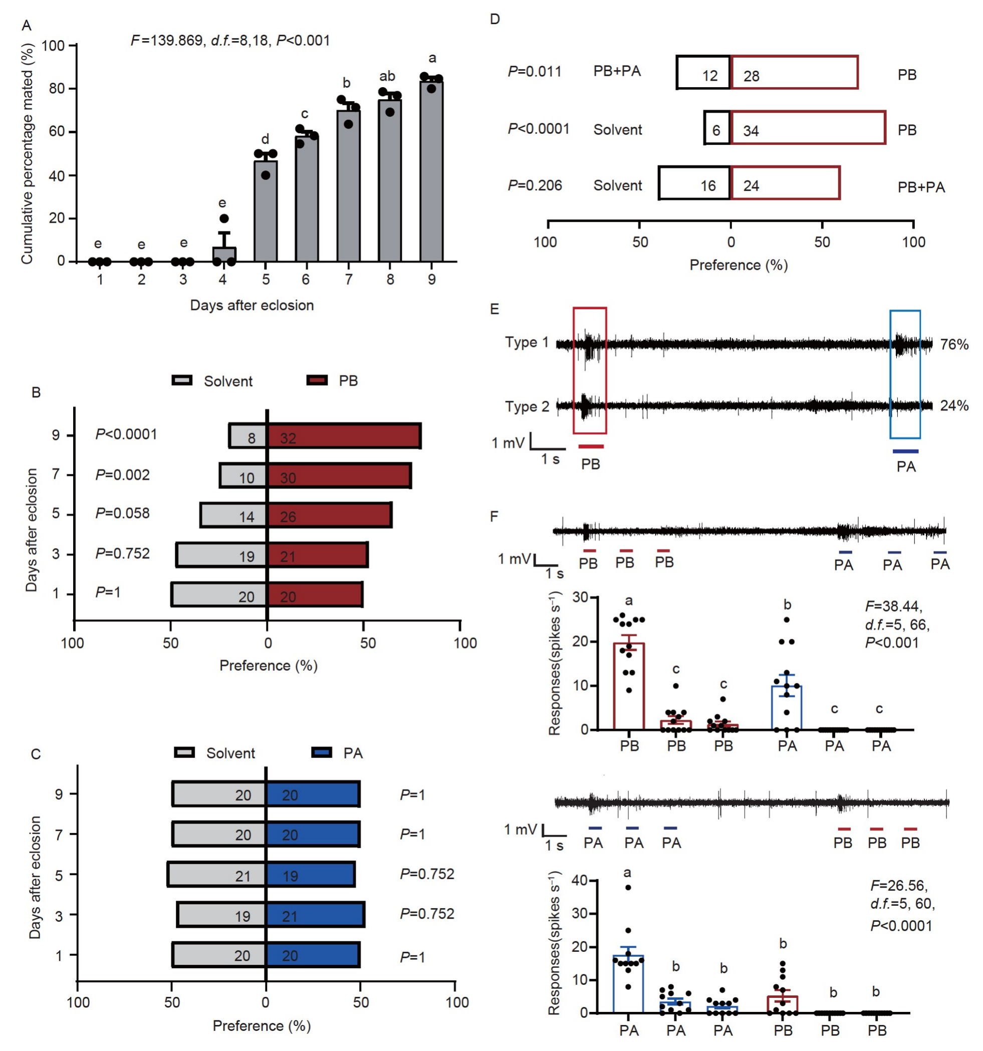 研究團隊使用Y型管嗅覺儀對不同日齡的雄蟲進行了行為學(xué)測試,以觀察它們對PB和PA的反應(yīng)。此外,通過視頻記錄和分析,評估了雄蟲的交配行為。交配率在5 DAE時增加到近50%,6 DAE時增加到60%以上,此后緩慢而穩(wěn)定地積累(圖1A)。雄蟲對PB和PA的偏好測試結(jié)果反應(yīng),PB是主要的性信息素成分,能夠顯著吸引雄蟲。而PA雖然單獨存在時不吸引雄蟲,但其存在能夠減弱PB的吸引作用(圖1B-D),表明PA可能在調(diào)節(jié)性行為中起到平衡作用。