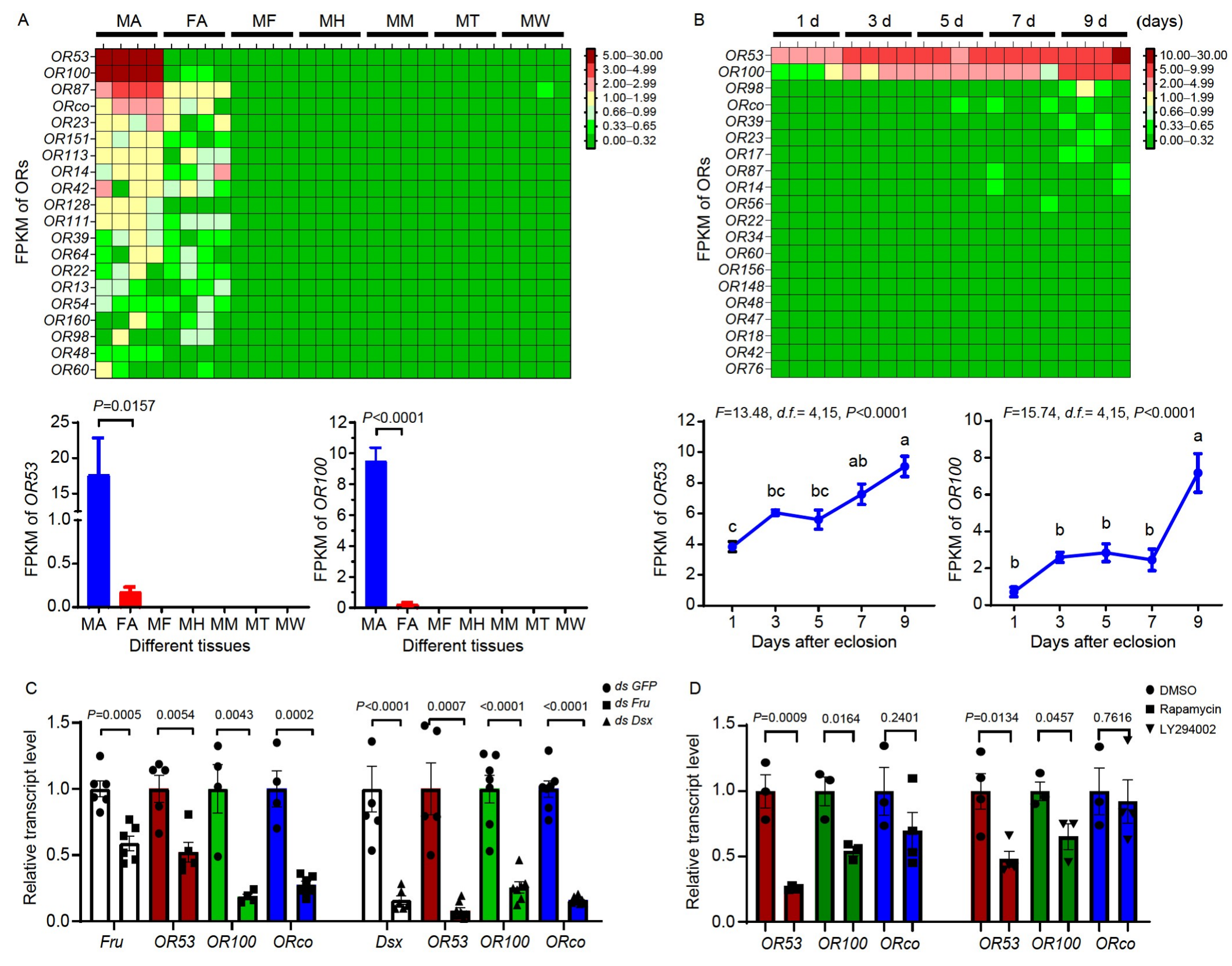 研究人員利用Bulk RNA測序技術(shù)分析了雄蟲不同組織中嗅覺受體基因的表達情況,并通過果蠅遺傳學(xué)方法,將美洲大蠊的嗅覺受體基因在果蠅中表達,以鑒定PA和PB的受體。通過RNA測序分析得到的嗅覺受體基因在不同組織(雄蟲觸角-MA、雌蟲觸角-FA、雄蟲前足-MF、雄蟲頭部-MH、雄蟲口器-MM、雄蟲精巢-MT和雄蟲翅-MW)和不同日齡中的表達水平(圖2A、2B),以及通過qPCR驗證的OR53、OR100ORco基因在雄蟲觸角中敲除frudsx基因后的表達水平(圖2C),以及經(jīng)過營養(yǎng)信號通路抑制劑處理后的表達水平變化(圖2D)。研究鑒定出OR53OR100為PA/PB和PA的受體,并發(fā)現(xiàn)它們在雄蟲觸角中的表達模式與行為測定結(jié)果相吻合,證實了這兩種受體在性信息素感知中的關(guān)鍵作用。