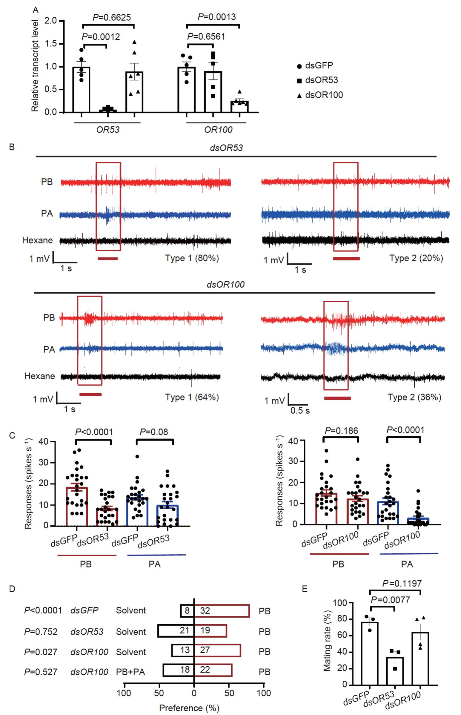 研究人員利用UAS-OR53UAS-OR100轉(zhuǎn)基因果蠅品系,通過RNAi實驗敲除了美洲大蠊中的OR53OR100基因,進而研究這些嗅覺受體在求偶交配行為中的作用。敲除這些基因后對PA和PB反應(yīng)的SSR測試結(jié)果,敲低OR53的表達顯著削弱了ORN對PB的反應(yīng),但對ORN對PA的反應(yīng)只有輕微的影響(圖3B)。OR53OR100基因敲除對雄蟲行為選擇和交配率的影響(圖3D、3E)。敲除實驗證實了OR53OR100在性信息素感知和行為調(diào)控中的關(guān)鍵作用,特別是OR53在PB誘導(dǎo)的求偶交配行為中的重要性。OR100的敲除則表明PA可能通過OR100發(fā)揮調(diào)節(jié)作用。
