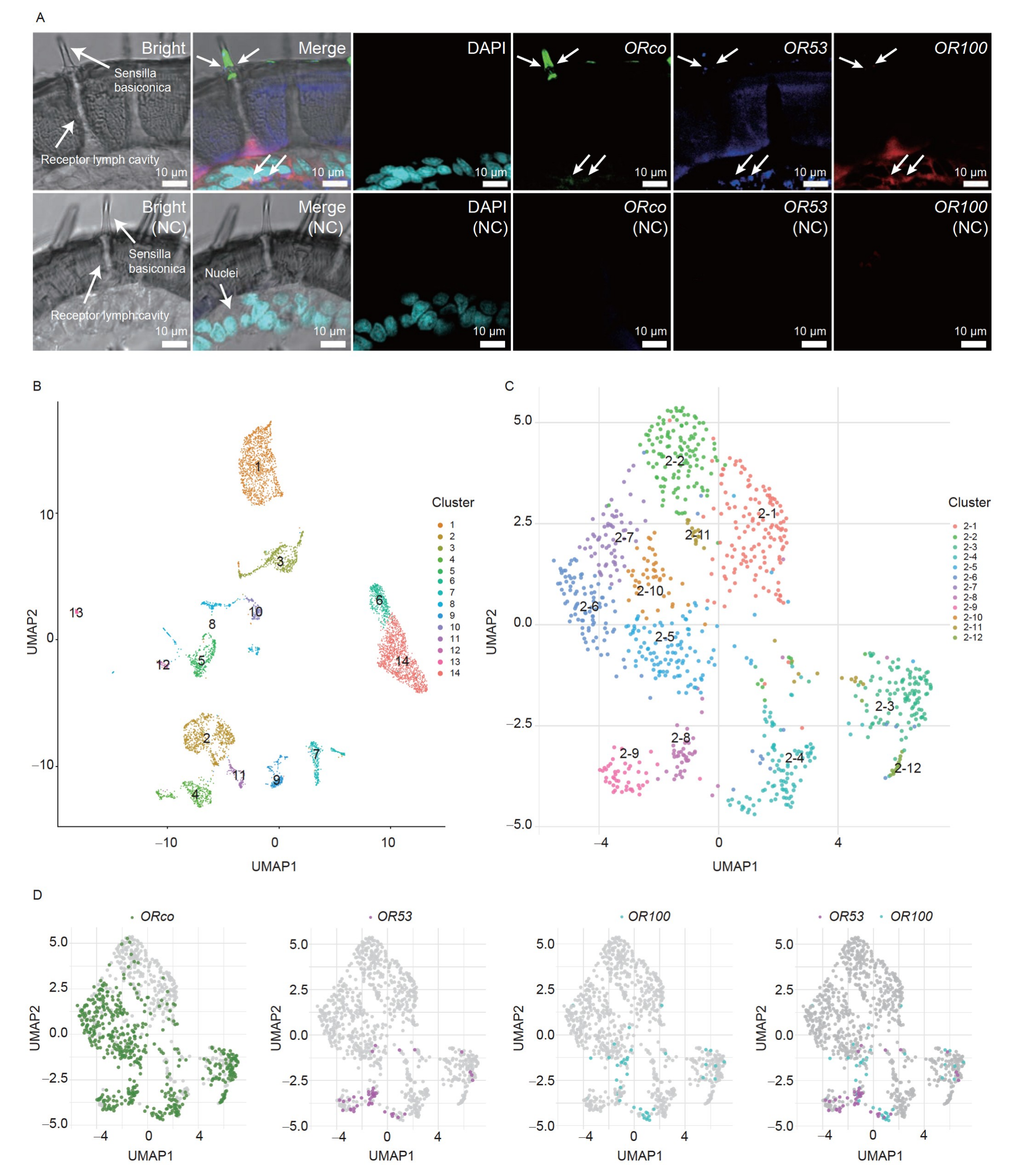 研究人員利用FISH技術(shù),觀察到OR53、OR100ORco經(jīng)常在同一個感受器中表達,說明大多數(shù)基本感受器同時含有OR53OR100的ORN。為了更系統(tǒng)地研究OR基因的表達,研究人員使用性成熟雄蟲的觸角進行了單細胞測序。測定每簇細胞的基因表達水平,鑒定出Cluster 2為ORco高表達的ORN(圖4B)。進一步分析Cluster 2細胞得到12個亞型(圖4C)。其中大部分感受器同時具有OR53OR100兩種OR53 ORNs,而少數(shù)感受器僅具有OR53?ORNs。12個亞型中有4個同時表達OR53OR100,可能對應(yīng)于主要的1-型感受器的ORNs。在2-亞型中,還發(fā)現(xiàn)了OR53的顯著表達亞型,可能對應(yīng)2型感受器的ORNs,也可能只有少量的感受器OR100?ORNs(圖4D)。這些結(jié)果進一步支持了性成熟雄蟲觸角中至少存在兩種錐形感受器。