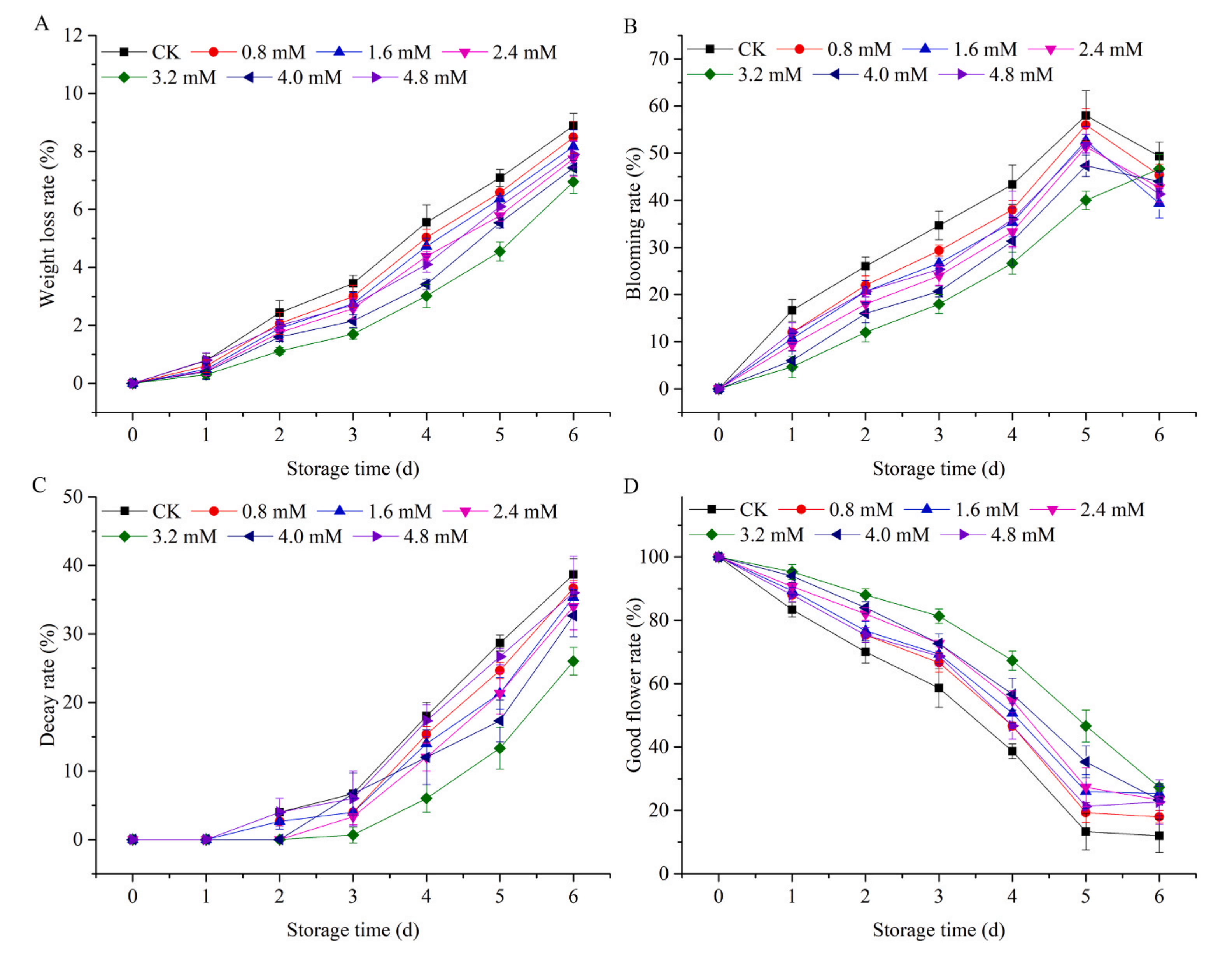 本研究選用黃花菜(萱草)“大同黃花”,產(chǎn)于中國(guó)山西省大同市云州區(qū)。花蕾是在商業(yè)成熟前采摘的。將剛采收的黃花菜花蕾在4℃預(yù)冷后,在4 h內(nèi)立即運(yùn)至實(shí)驗(yàn)室?;ɡ兕伾?、形狀、大小均勻,無(wú)物理?yè)p傷,分為7組。將每組黃花菜芽(200 g)分別置于含有200 mL蒸餾水、0.8、1.6、2.4、3.2、4.0、4.8 mM NaHS溶液(H2S供體)的干燥器中。干燥劑保存于4℃,相對(duì)濕度85% ~ 95%。測(cè)定了黃花菜的失重率、開(kāi)花率、腐爛率和良花率,初步評(píng)價(jià)了黃花菜的品質(zhì)。