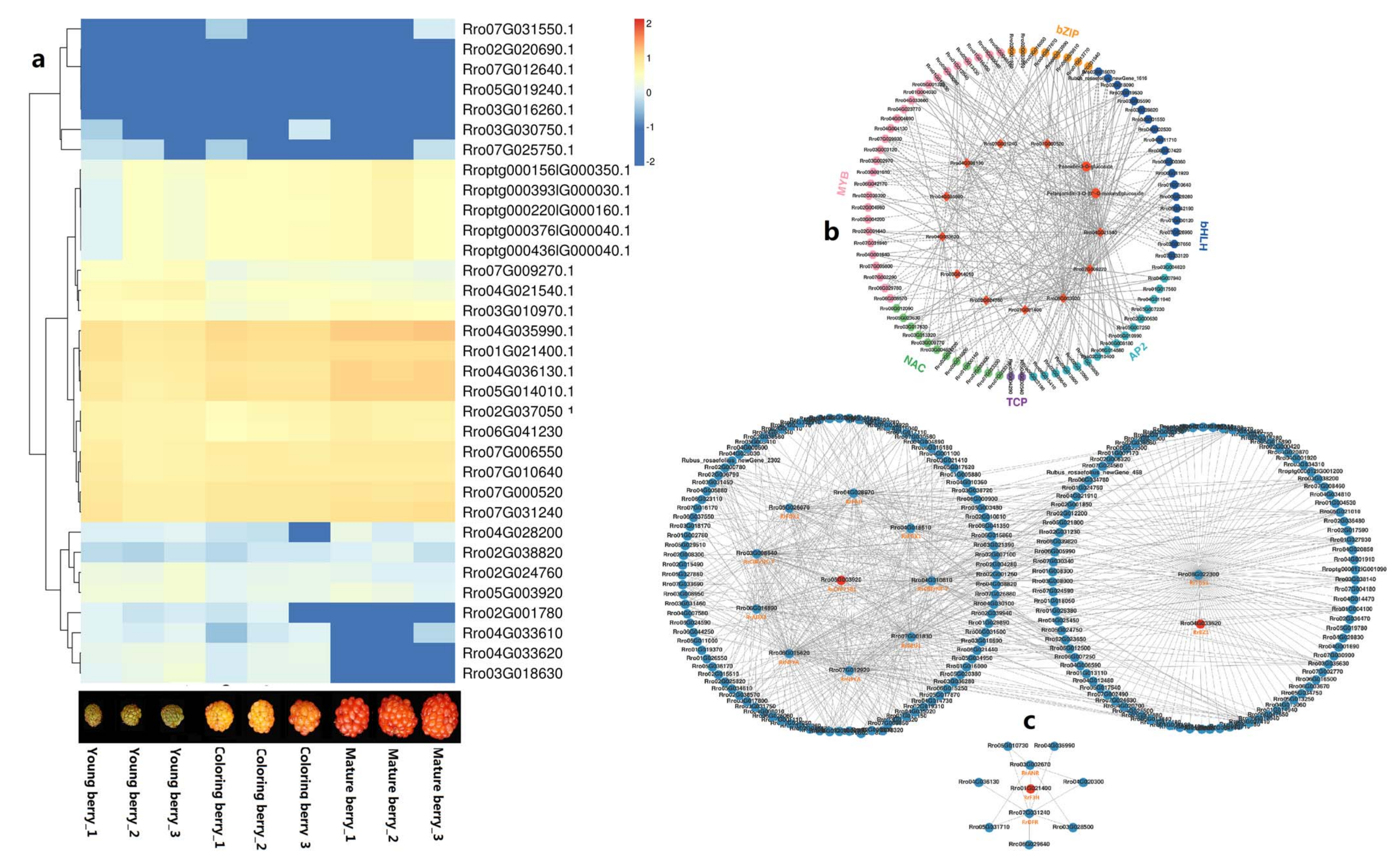 為了探索空心藨紅漿果中花青素生物合成調(diào)控的分子機(jī)制,該研究對(duì)空心藨紅漿果幼齡期和成熟期的轉(zhuǎn)錄組和代謝組進(jìn)行了相關(guān)性分析。在成熟漿果中發(fā)現(xiàn)的主要花青素——芍藥苷-3-O-葡萄糖苷和芍藥苷-3-O-(6’’-O-丙二酰基)葡萄糖苷被鑒定為顯著差異積累代謝產(chǎn)物(DAMs),其中11個(gè)結(jié)構(gòu)基因被發(fā)現(xiàn)為差異表達(dá)基因(DEGs)。其中,Rro07G000520.1 (RrBZ1)、rro07g035990.1和rro07g036130.1 (RrCHS)、rro07g06550.1 (RrCHI)、rro07g021400.1 (RrF3H)、Rro07G031240.1 (RrDFR)和Rro05G014010.1 (RrANS)與芍藥苷-3-O-葡萄糖苷積累呈正相關(guān),而Rro07g033620.1、Rro07g024760.1 (RrBZ1)、Rro07G009270.1 (RrUGT75C1)、Rro04G021540.1 (RrUGT79B1)與這兩種物質(zhì)呈負(fù)相關(guān)(圖6b)。編碼屬于MYB、bHLH、AP2、bZIP、NAC和TCP家族轉(zhuǎn)錄因子的幾個(gè)DEGs的表達(dá)與上述一個(gè)或多個(gè)結(jié)構(gòu)基因和兩個(gè)DEGs呈顯著正相關(guān)或負(fù)相關(guān)(圖6b)。這些發(fā)現(xiàn)表明轉(zhuǎn)錄因子廣泛參與了空心藨花青素生物合成的調(diào)控。通過蛋白-蛋白相互作用(PPI)分析,該研究發(fā)現(xiàn)Rro4G033620蛋白(RrBZ1)與三甲基鳥苷合成酶1 (RrTGS1)直接相互作用,Rro5G003920蛋白(RrBZ1)直接與鐵氧還蛋白C1 (RrFDX1)、CCAAT結(jié)合轉(zhuǎn)錄因子(RrNFYA)、谷氨酸合成酶1 (RrGLU1)和組蛋白樣轉(zhuǎn)錄因子(RrCBF/NF-Y)相互作用,Rro1G021400蛋白(RrF3H)直接與RrFDR和RrANR相互作用(圖6c)。上述結(jié)果表明,空心藨花青素的合成受RNA甲基化、結(jié)構(gòu)基因編碼蛋白和轉(zhuǎn)錄因子的相互作用調(diào)控。