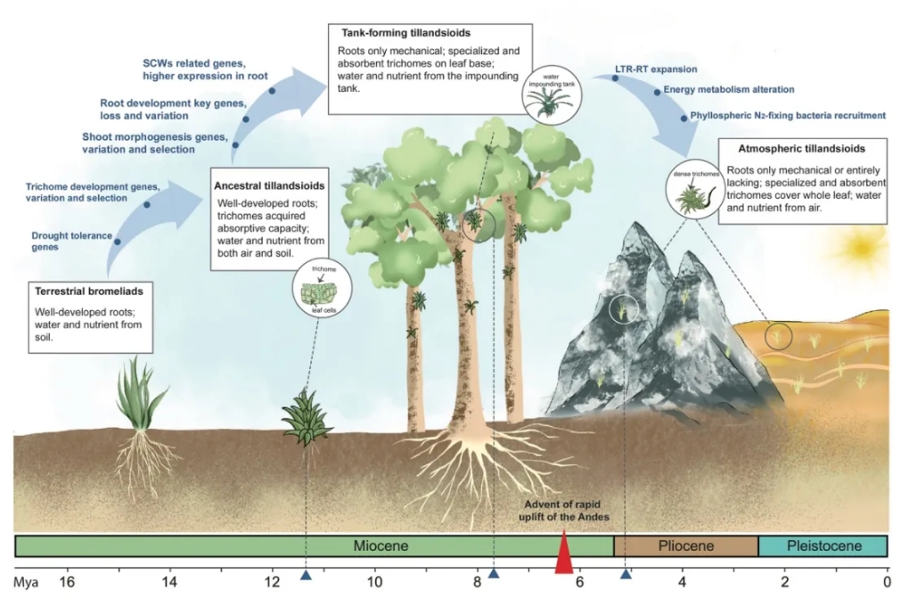 空氣植物的進(jìn)化引發(fā)了幾個(gè)值得思考的問題:它們是何時(shí)、何地從陸生環(huán)境轉(zhuǎn)向空中棲息地的?是什么驅(qū)動(dòng)了這一轉(zhuǎn)變?空氣植物失去根部功能的遺傳基礎(chǔ)是什么?葉片上的特殊毛狀體是如何代替根部執(zhí)行吸收功能?最重要的是,它們?nèi)绾卧诳罩协h(huán)境中獲取必需的營(yíng)養(yǎng)物質(zhì)?