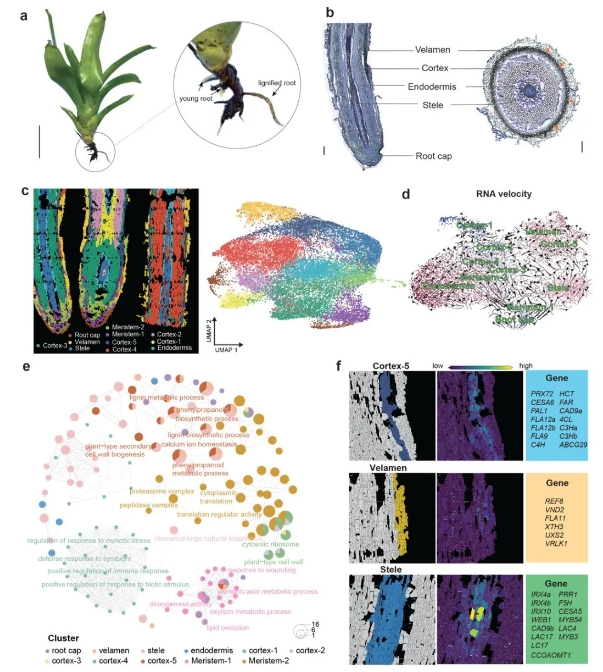 空氣鳳梨的根部功能顯著退化,主要僅發(fā)揮機(jī)械“固著”作用或完全缺失。通過基因組和比較基因組分析(圖3a-e),研究人員發(fā)現(xiàn)與根發(fā)育相關(guān)的關(guān)鍵基因(如SCR、WER、TTG1、JKD)在附生鳳梨類群中發(fā)生了快速進(jìn)化,并受到選擇固定(圖3i-j)。與側(cè)根發(fā)育相關(guān)的AR1基因家族則出現(xiàn)顯著收縮。與根系響應(yīng)重力的關(guān)鍵基因ARG1丟失,而負(fù)調(diào)控基因WG2則受到正向選擇。同時(shí),根系對(duì)水分響應(yīng)的關(guān)鍵基因EN1也發(fā)生喪失。這些結(jié)果表明,空氣植物的進(jìn)化適應(yīng)增強(qiáng)了它們?cè)诖髿馍鷳B(tài)位中的生存能力。此外,利用相同的方法,研究人員還找到了空氣鳳梨耐旱的基因組適應(yīng)性進(jìn)化的關(guān)鍵基因(圖3f-g)和積水類型鳳梨蓄水槽形成的關(guān)鍵基因AS1的變異選擇(圖3h)。此外,研究人員通過空間轉(zhuǎn)錄組分析發(fā)現(xiàn),與次生細(xì)胞壁合成相關(guān)的多個(gè)基因在根被和皮層組織中表現(xiàn)出快速表達(dá),為根系在生長(zhǎng)過程中迅速木質(zhì)化并發(fā)揮機(jī)械“固著”作用提供了分子基礎(chǔ)(圖4)。
