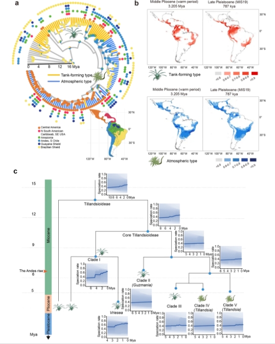 為了追溯空氣鳳梨的起源,研究人員廣泛收集了覆蓋空氣鳳梨亞科(Tillandsioideae)78%屬的植物,利用轉(zhuǎn)錄組測(cè)序獲得低拷貝基因的91個(gè)核基因,構(gòu)建了空氣鳳梨亞科植物系統(tǒng)發(fā)育樹(圖1)。然后通過祖先重建和分子鐘計(jì)算,發(fā)現(xiàn)核心空氣鳳梨亞科植物起源于11.3百萬(wàn)年前的安第斯山脈,祖先類型為積水型鳳梨(圖2a)。大約在6百萬(wàn)年前,安第斯山脈快速隆起,推動(dòng)了物種的分化,完全大氣生的空氣鳳梨出現(xiàn),這些植物通常被稱為“air plants”。地球氣候世代的轉(zhuǎn)變也加速了物種的分化(圖2b-c)。