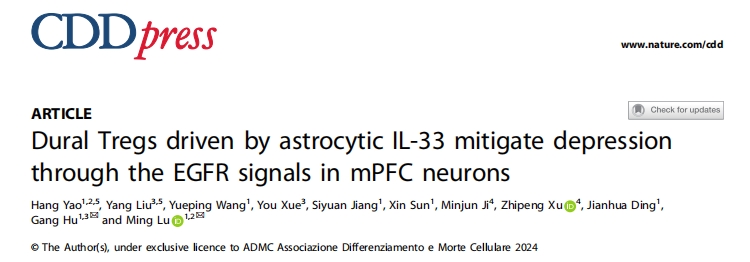 2024年11月,南京醫(yī)科大學(xué)基礎(chǔ)醫(yī)學(xué)院藥理學(xué)系魯明教授、胡剛教授團(tuán)隊在Cell Death & Differentiation發(fā)表題為”Dural Tregs Driven by Astrocytic IL-33 Mitigate Depression Through the EGFR Signals in mPFC Neurons”的研究論文,使用單細(xì)胞轉(zhuǎn)錄組測序技術(shù)等多種技術(shù),深入闡述小鼠硬腦膜免疫細(xì)胞的抗抑郁機(jī)制,為抑郁癥治療提供了新的潛在治療靶點。接下來是本文的詳細(xì)解讀。
