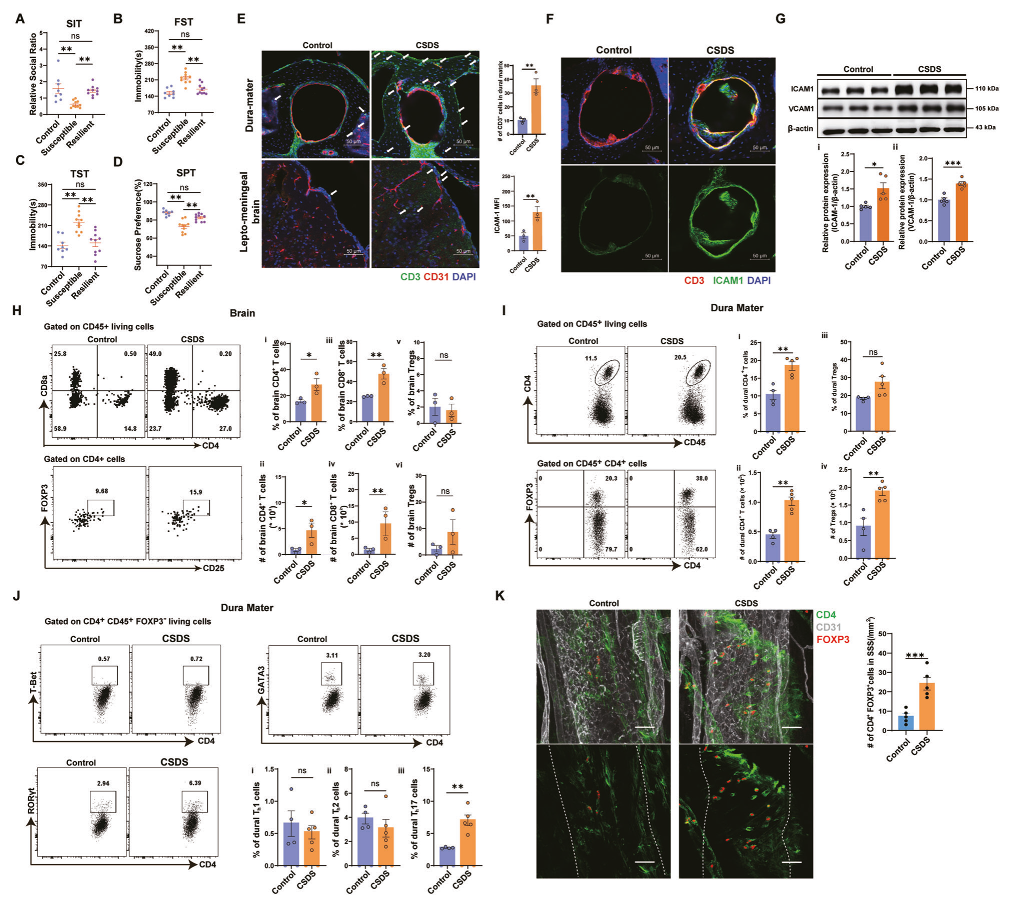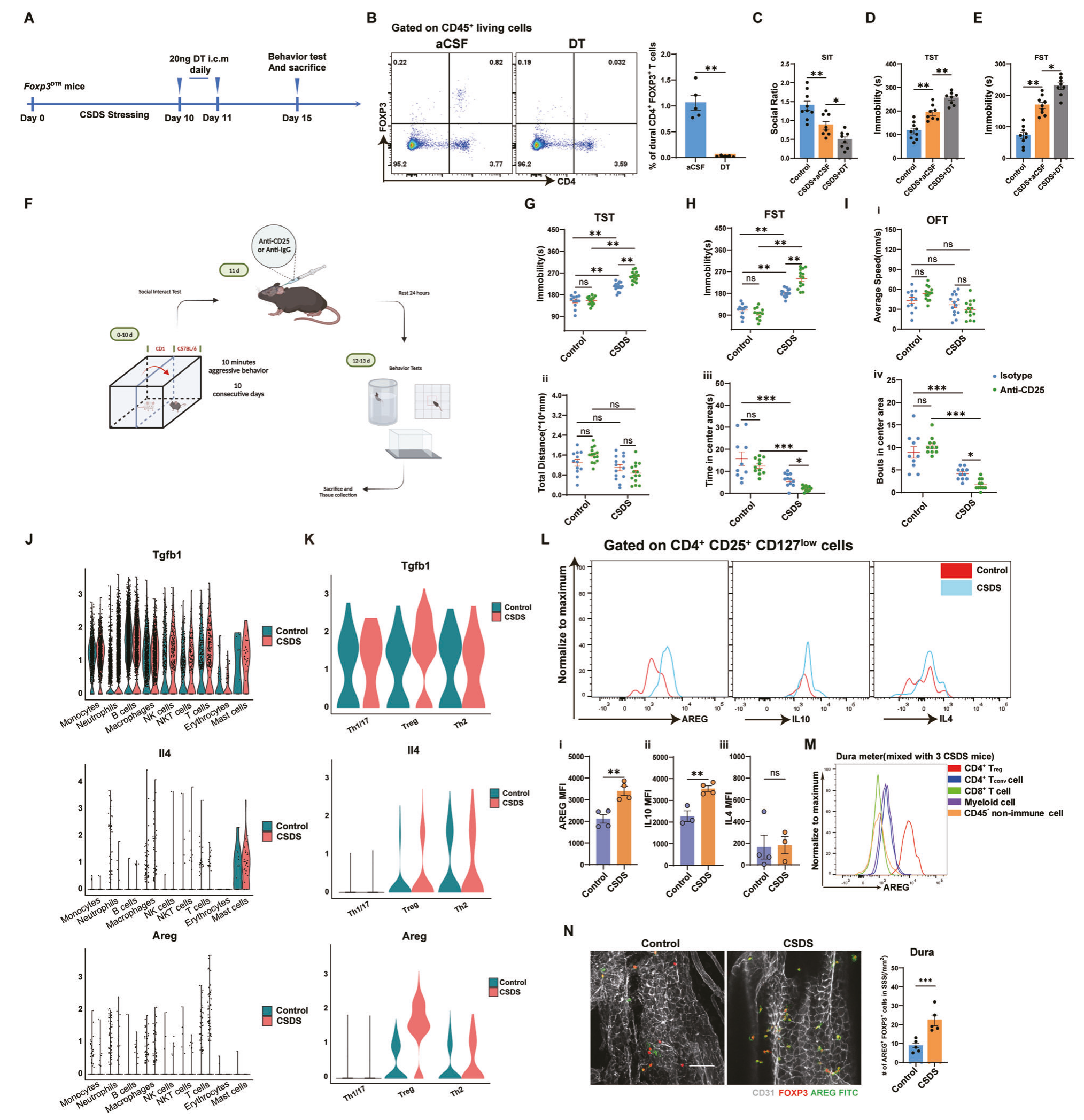 圖1-CSDS刺激顯著誘導(dǎo)了小鼠硬腦膜中Treg的浸潤
