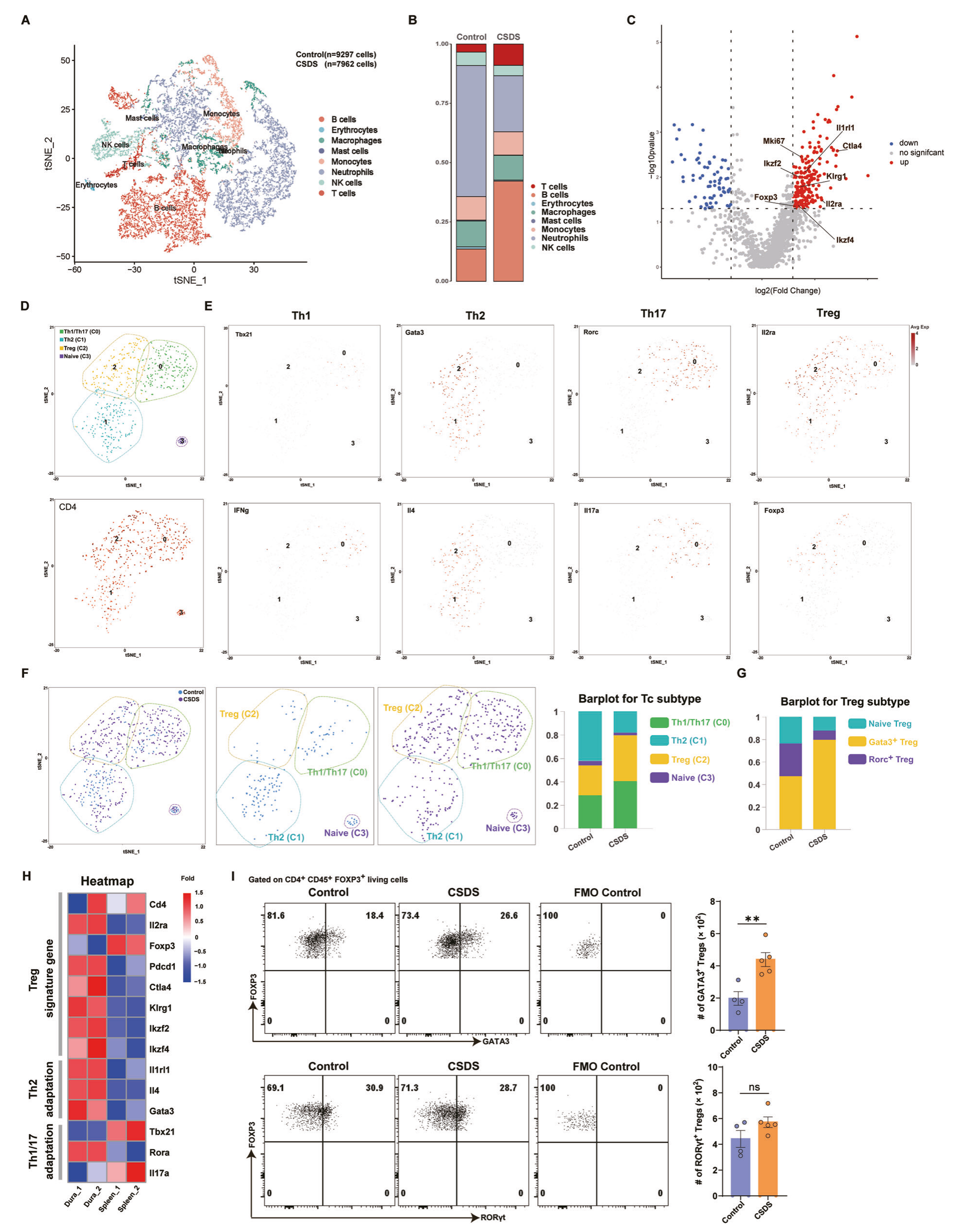 CSDS小鼠和對照組小鼠硬腦膜分選得到的免疫細(xì)胞進(jìn)行scRNA-seq,結(jié)果顯示CSDS小鼠硬腦膜T細(xì)胞占比增加,其中Treg和Th17比例增加,Th2比例降低,初始T細(xì)胞沒有發(fā)生變化;Treg中,Gata3+?Treg比例提高,初始Treg和Rorx+?Treg比例降低。對照組小鼠硬腦膜和脾臟分選得到Treg進(jìn)行SMART-seq,發(fā)現(xiàn)與脾臟相比,硬腦膜Treg的Gata3+亞型和Rora+亞型相關(guān)基因表達(dá)上調(diào)。流式細(xì)胞術(shù)進(jìn)一步證實CSDS小鼠硬腦膜中GATA3+?Treg顯著增加,RORγt+?Treg數(shù)量無顯著變化。這些表明GATA3+ Treg可能參與抑郁表現(xiàn)的調(diào)控。