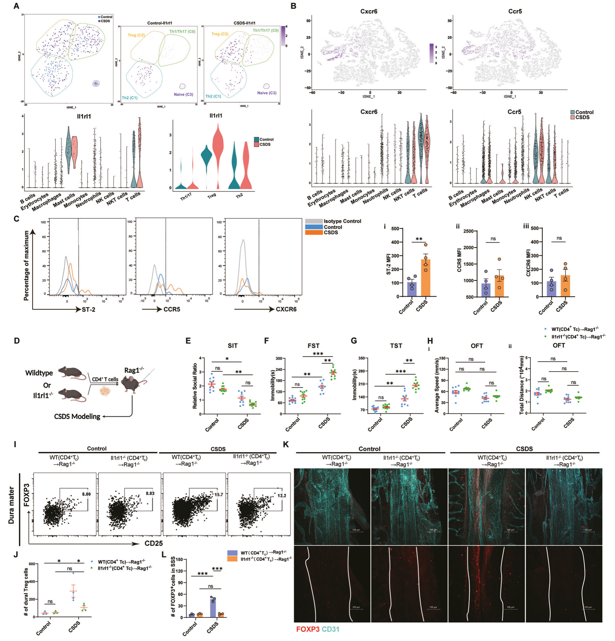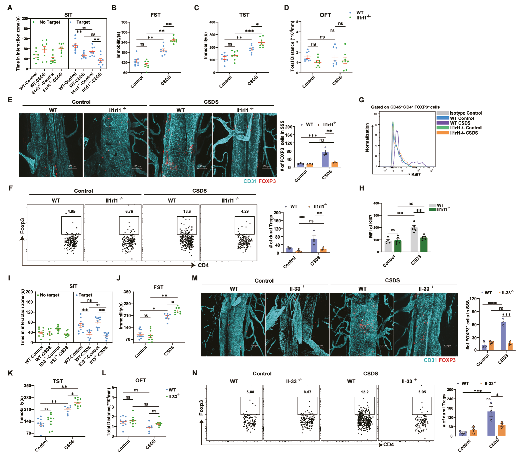 SMART-seq數(shù)據(jù)顯示CSDS小鼠硬腦膜“IL33結(jié)合”以及其他內(nèi)源性分子結(jié)合信號通路表達(dá)上調(diào);與脾臟相比,CSDS小鼠硬腦膜中表達(dá)ST2的細(xì)胞比例顯著高于脾臟;硬腦膜Treg富集趨化性通路。scRNA-seq數(shù)據(jù)也顯示CSDS小鼠模型中T淋巴細(xì)胞聚群高表達(dá)ST2編碼基因,且表達(dá)水平高于對照組小鼠的T淋巴細(xì)胞;CSDS小鼠模型硬腦膜Treg高表達(dá)ST2編碼基因。隨后,研究者將WT小鼠和Il1rl1-/-小鼠硬腦膜Treg細(xì)胞轉(zhuǎn)移到Rag1-/-小鼠并構(gòu)建CSDS模型,行為學(xué)等實驗結(jié)果證實,ST2表達(dá)是硬腦膜Treg招募和擴(kuò)張所必須的。IL33-/-小鼠相關(guān)實驗也支持了IL33/ST2信號在抑郁期間促進(jìn)硬腦膜Treg增殖。