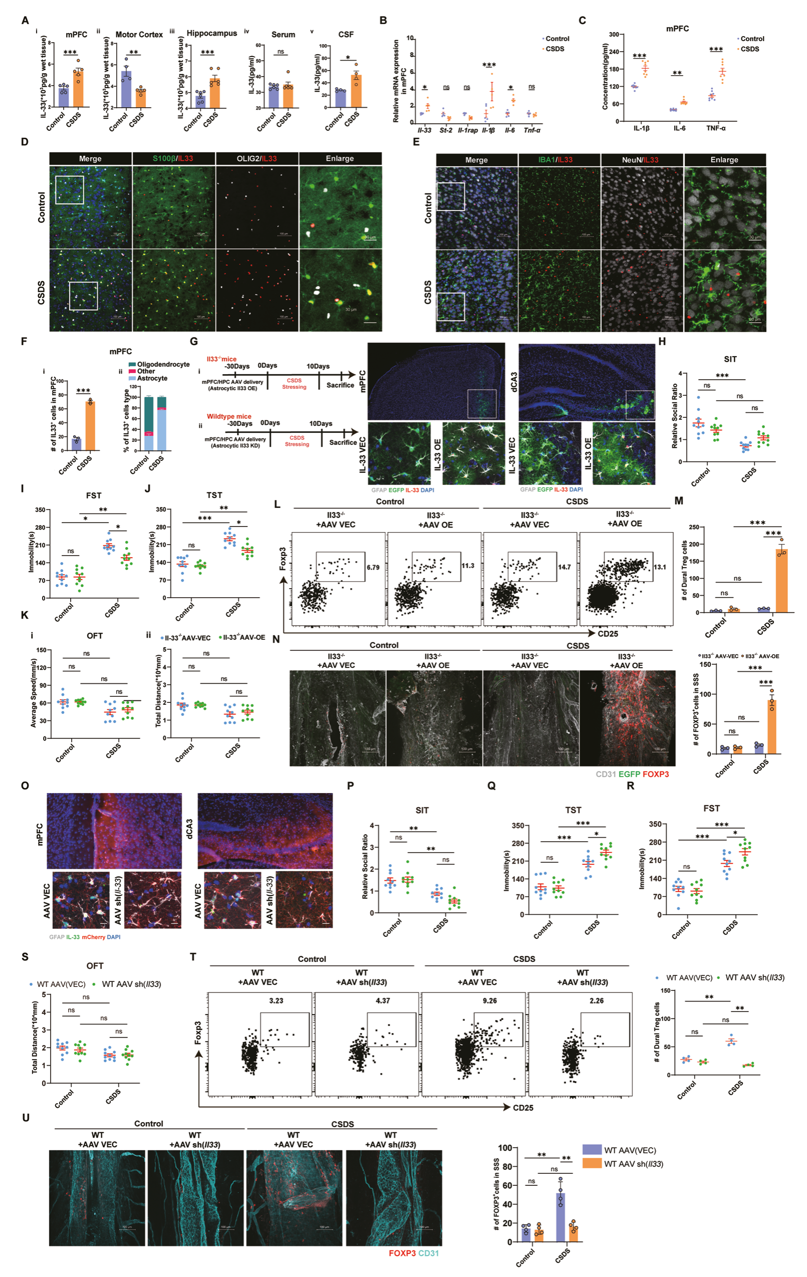 mPFC、海馬、腦脊液等組織的ELISA、qPCR以及Western blot實驗結(jié)果表明,CSDS小鼠硬腦膜ST2+ Treg激活所需的IL33來源于腦實質(zhì)而不是硬腦膜。多重免疫熒光結(jié)果表明mPFC處星形細(xì)胞是IL33增加的主要貢獻(xiàn)細(xì)胞類型。進(jìn)一步的特異性細(xì)胞類型IL33基因表達(dá)KO-恢復(fù)實驗及相應(yīng)的行為學(xué)實驗、流式細(xì)胞術(shù)等結(jié)果表明,主要是星形細(xì)胞來源的IL33介導(dǎo)了CSDS小鼠中硬腦膜Treg的產(chǎn)生。