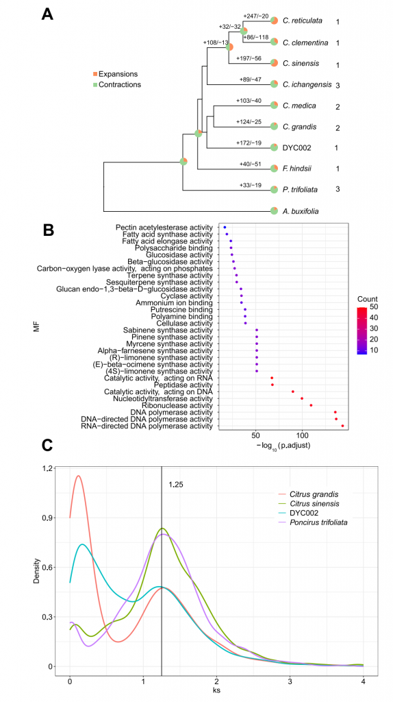 作者利用53.7G PacBio HiFi、22.6G illumina reads和40.1G Hi-Creads,首先組裝出318.71 Mbp大小的contig版本基因組,contig N50為2.48 M,接著利用HIC數(shù)據(jù)將contig 掛載到染色體上,得到得到294 Mbp的基因組,BUSCO評估完整性大于98%,LTR組裝指數(shù)(LAI)得分高達(dá)21.1,測序數(shù)據(jù)回比率為97.43%,進(jìn)一步支持了組裝的完整性。最后對DYC002基因組注釋,共注釋到34,652個蛋白編碼基因和215,693個重復(fù)序列。重復(fù)序列多為LTR,尤其是Gypsy LTR和Copia LTR,占組裝基因組的23.62%。比較基因組發(fā)現(xiàn)DYC002有191個基因家族正在快速進(jìn)化。GO富集分析表明,這些快速進(jìn)化的基因主要富集于萜烯合酶活性、倍半萜合酶活性、(4S)-檸檬烯合酶活性、(E)-檸檬烯合酶活性、葡萄糖苷酶活性和-葡萄糖苷酶活性等功能,表明DYC002在進(jìn)化過程中香氣和風(fēng)味發(fā)生了顯著變化。