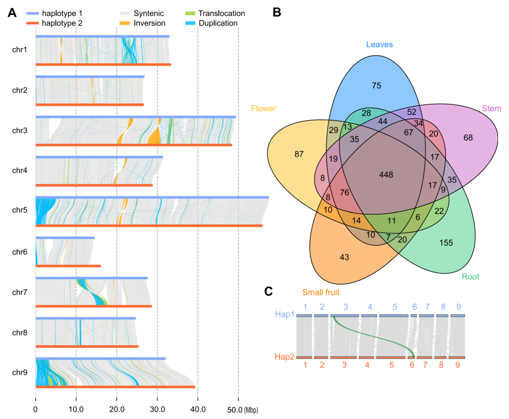 利用CCS數(shù)據(jù)和HIC數(shù)據(jù),作者組裝出DYC002的兩套單倍型基因組,長度分別為294和300 Mbp,注釋的基因數(shù)量分別為28000和27785個;BUSCO完整度分別為97.39%和97.33%。通過比較分析,兩單倍型基因組間存在175萬個SNPs,303,686個Indels,轉(zhuǎn)錄組分析表明,兩個單倍型中等位基因的表達(dá)高度一致。葉片中等位基因特異性表達(dá)基因(ASEGs)數(shù)量最高,而花中數(shù)量最低。在單倍型1和單倍型2的組裝中分別發(fā)現(xiàn)了535個和499個單倍型特異性基因。