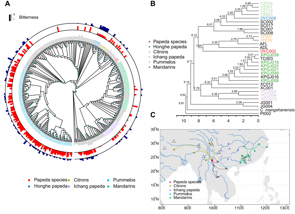 柑橘是世界上種植最廣泛的水果之一,目前在140多個國家和地區(qū)種植。雖然過去的二十年里柑橘植物的種群結(jié)構(gòu)和遺傳多樣性已被調(diào)查,但由于其豐富的資源類型和雜交頻繁,許多柑橘物種的起源和進(jìn)化仍不清楚。野生柑橘物種和原始柑橘保存了豐富的遺傳資源和遺傳多樣性,可用于闡明柑橘物種的起源和進(jìn)化。2015年,在西雙版納發(fā)現(xiàn)一棵200多年的野生柑橘樹大翼葉柑橘(DYC002),被認(rèn)為是研究柑橘進(jìn)化及苦味馴化的很好材料。