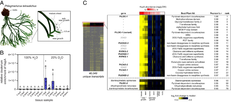 為了指導(dǎo)對石松生物堿生物合成的研究,作者重點(diǎn)關(guān)注 HupA,因?yàn)樗阎哂凶鳛?AChE 抑制劑的活性和作為藥物的潛力。HupA 由石松屬內(nèi)的物種產(chǎn)生,但這些物種的 HupA 積累水平差異很大。作者推斷物種中 HupA 的增加可能與上調(diào)的生物合成基因表達(dá)有關(guān)。因此,檢測了石松屬的幾個(gè)物種的 HupA 含量,結(jié)果發(fā)現(xiàn)P. tetrastichus(圖 2A)積累了 HupA 到最高水平。因此,后續(xù)的研究將集中在該物種上。之前的研究表明,從頭 HupA 生物合成對P. tetrastichus枝條的新生長具有特異性,接著作者通過氘同位素標(biāo)記實(shí)驗(yàn)得到驗(yàn)證,并且發(fā)現(xiàn)與莖相比,HupA標(biāo)記在葉中更廣泛分布,表明這里的生物合成基因表達(dá)富集(圖2B)。因此,作者對對該物種的多個(gè)組織進(jìn)行了RNA-seq分析,揭示石杉生物堿生物合成基因在活性組織中的積累機(jī)制。
