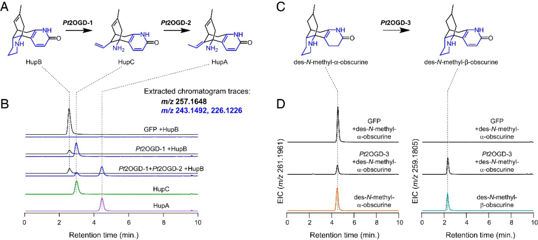 為進(jìn)一步研究其他下游生物合成途徑。特別是,兩種石松生物堿,des-N-methyl-α-obscurine(DNMAO)和des-N-methyl-β-obscurine(DNMBO),與HupB共享相同的碳骨架,可能是HupB的前體(圖 5)。因此作者通過與上述已知基因的高共表達(dá)分析及體外酶活驗(yàn)證實(shí)驗(yàn)發(fā)現(xiàn)另一種獨(dú)特的2OGD酶(Pt2OGD-3)能將DNMAO轉(zhuǎn)化為DNMBO(圖5),從而形成最終在HupA中發(fā)現(xiàn)的吡啶酮環(huán)。并且發(fā)現(xiàn)Pt2OGD-1和Pt2OGD-2可以依次作用于DNMBO,以產(chǎn)生假定的HupC和HupA的8,15-二氫同系物。Pt2OGD-1不作用 DNMAO,表明在DNMBO和HupB中發(fā)現(xiàn)的吡啶酮環(huán)的存在對Pt2OGD-1底物結(jié)合和/或催化活性至關(guān)重要,但是參與其中的去飽和酶尚未被發(fā)現(xiàn)。