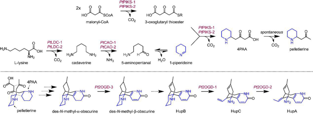 目前研究尚未證實(shí) HupA 生物合成中的任何下游中間體,但從各種苔蘚物種中分離生物堿可能與兩個(gè)含8碳哌啶的亞基摻入石松生物堿的生物合成相關(guān)(圖 1B)。但是詳細(xì)的代謝合成機(jī)制還不清楚。作者通過與4PAA/peletierine生物合成的 3 個(gè)高度共表達(dá)基因分析,作者發(fā)現(xiàn)了富集最顯著的一類酶:Fe(II)/2-氧代戊二酸依賴性雙加氧酶(2OGDs)(圖2B,C)。作者將這些高度共表達(dá)的2OGD作為下游石松生物堿代謝途徑中的強(qiáng)候選基因。
